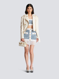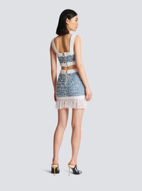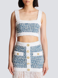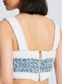 Denim tweed bralette top - Short and tight fit - Square neckline - Wide straps - Fastening with golden metal zip at the back - Model measures 178cm and wears a size 36 - Main material: 53% viscose 17% linen 14% cotton 11% polyester 5% polyamide - Made in France - Item: CF1AA001KF88