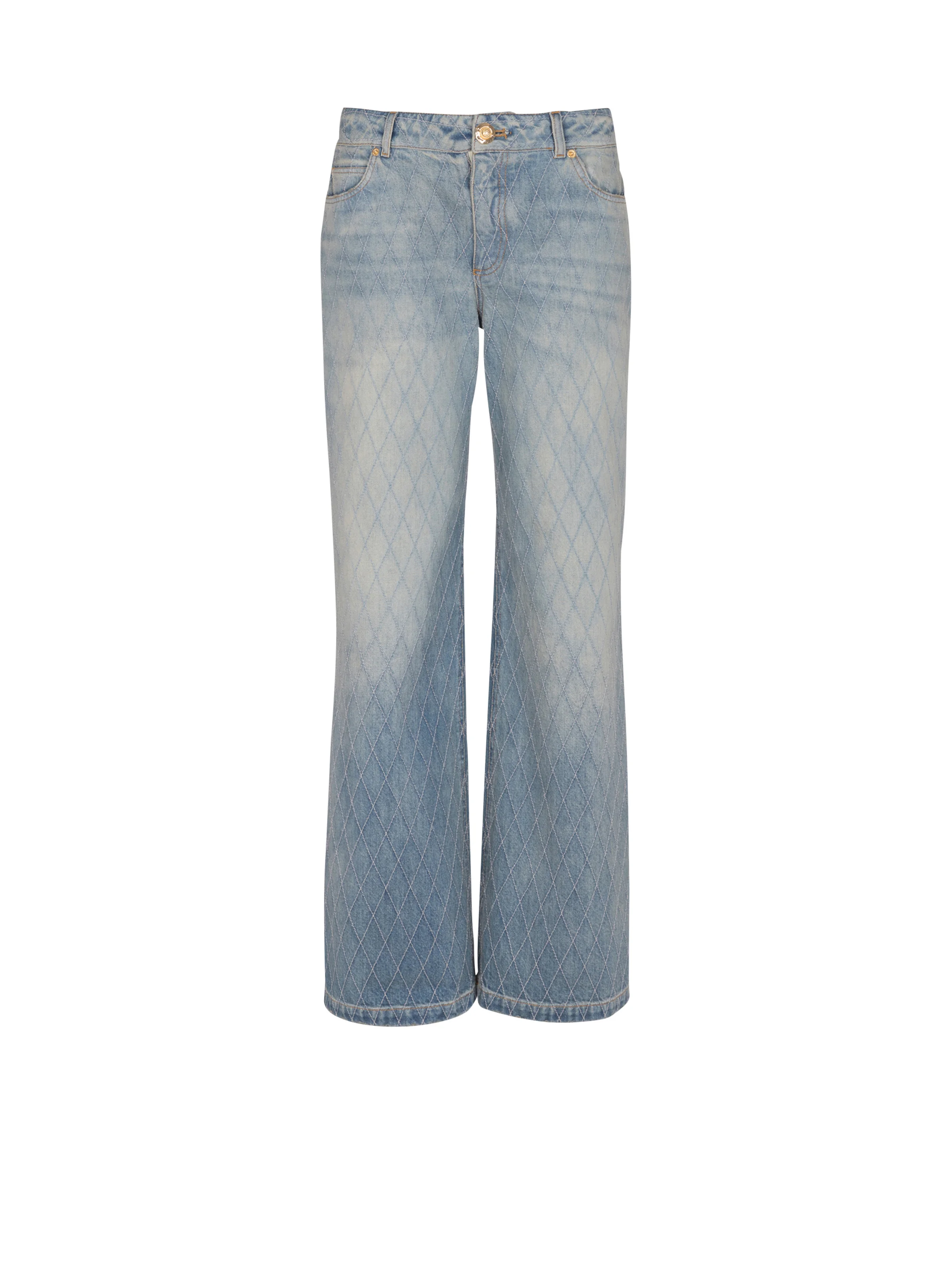 Blue topstitched denim jeans with Diamond pattern - Waistband with belt loops and a triple belt loop at the back - “Gold and Silver Coin” metal button fastening with zip and fly - 5 classic pockets - Woven Balmain Vintage label on the back - Engraved rivets - Gold hardware - Straight cut - Model measures 178cm and wears a size 36 - Main material: 100% cotton - Made in Italy - Item: FF1MI060DF79