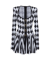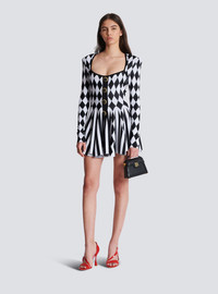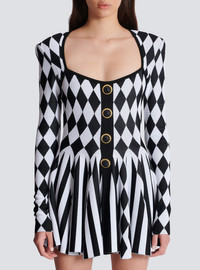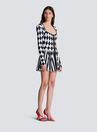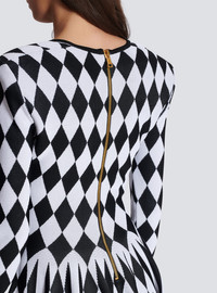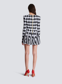 Diamond jacquard flared knit dress with striped flounce - Short flared cut - Low scoop neckline - Structured shoulders - Long sleeves - 4 decorative two-tone "Double Chain Lion" buttons in gold and black metal on the front - Visible gold metal zip fastening on the back with Balmain Paris-engraved slider - Two-tone knit - Ribbed edging - Model measures 180cm and wears a size 36 - Main material: 100% viscose - Made in France - Item: DF1R9493KG64100% of the viscose fibres used to make this garment come from certified, sustainably managed forests