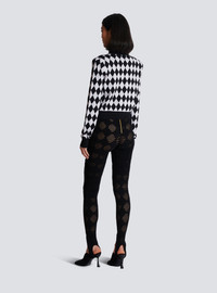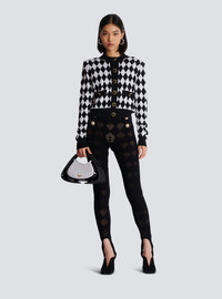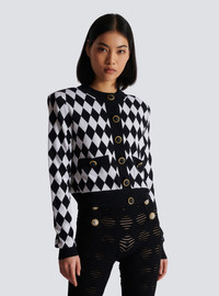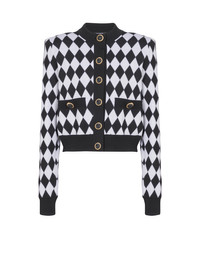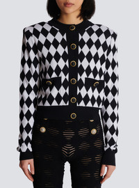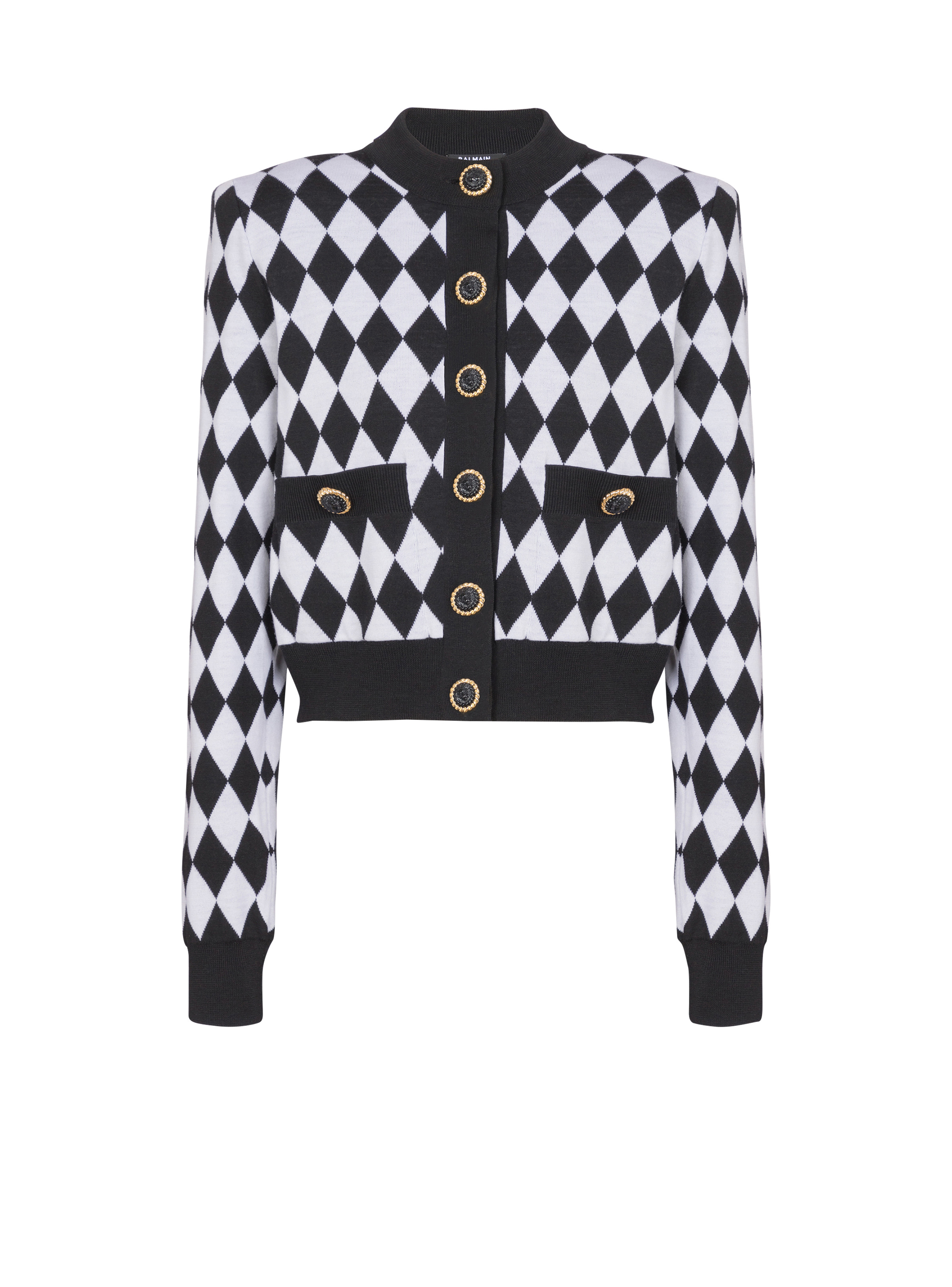 Diamond knit cardigan - Straight cut - Structured shoulders - Long sleeves - Round neckline - Fastening with 6 buttons - 2 fake patch pockets with 2 decorative buttons - Two-tone "Double Chain Lion" buttons in gold and black metal - Contrasting ribbed edging - Model measures 178cm and wears a size 36 - Main material: 61% wool 39% virgin wool - Made in Italy - Item: DF1KL133KG60