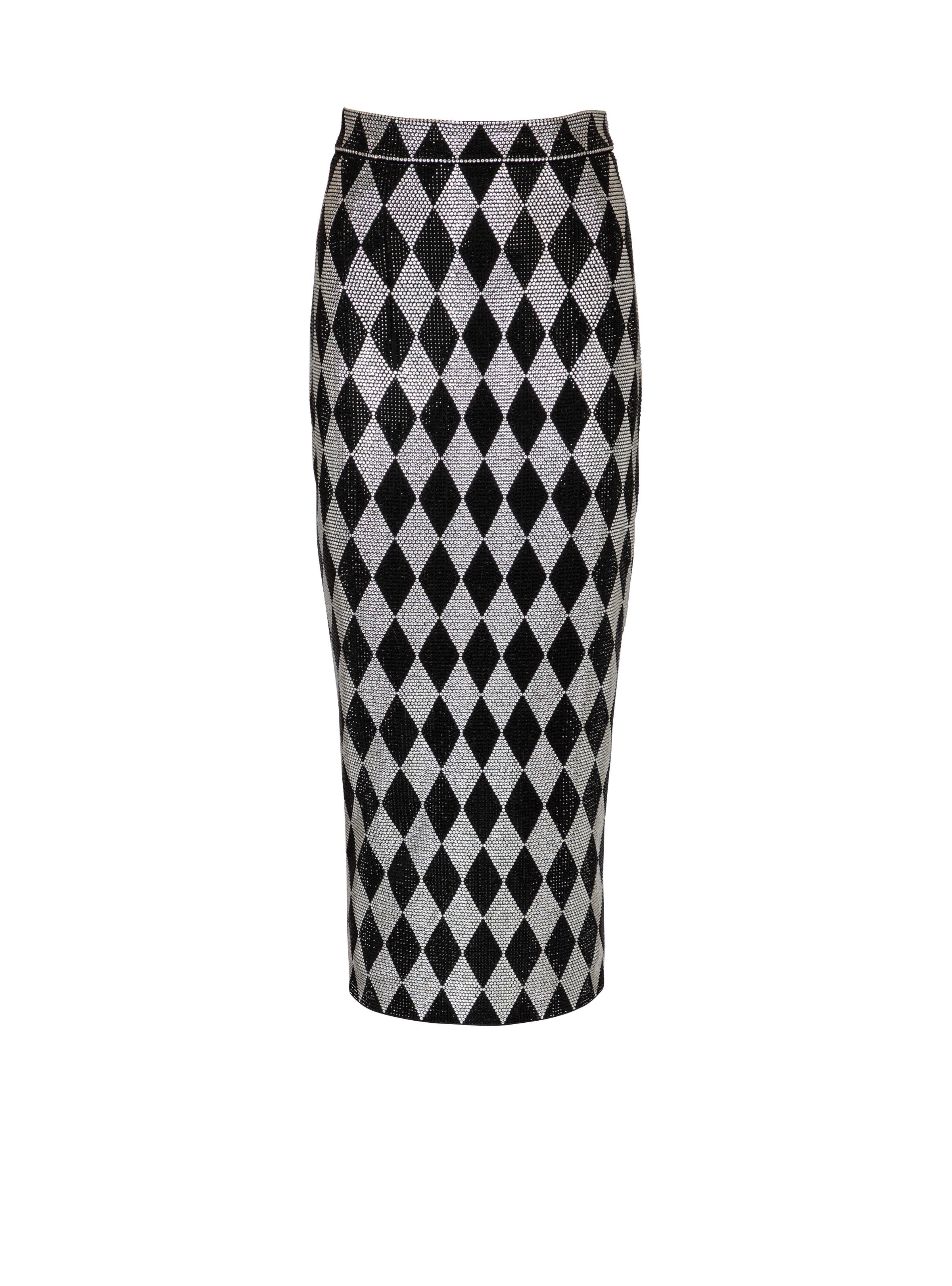Diamond rhinestone midi skirt - High fitted waist - Visible double black metal zip fastening on the back with Balmain Paris-engraved slider - Fabric with two-tone rhinestones - Satin lining - Model measures 178cm and wears a size 36 - Main material: 96% silk 4% elastane - Made in Italy - Item: DF1LD012PC42