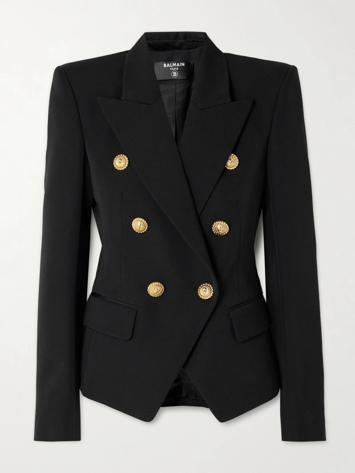 A Balmain blazer is one of the brand's most iconic pieces. This style is tailored from grain de poudre wool with sharp shoulders, while a V-shaped buttoned front nips in the waist.