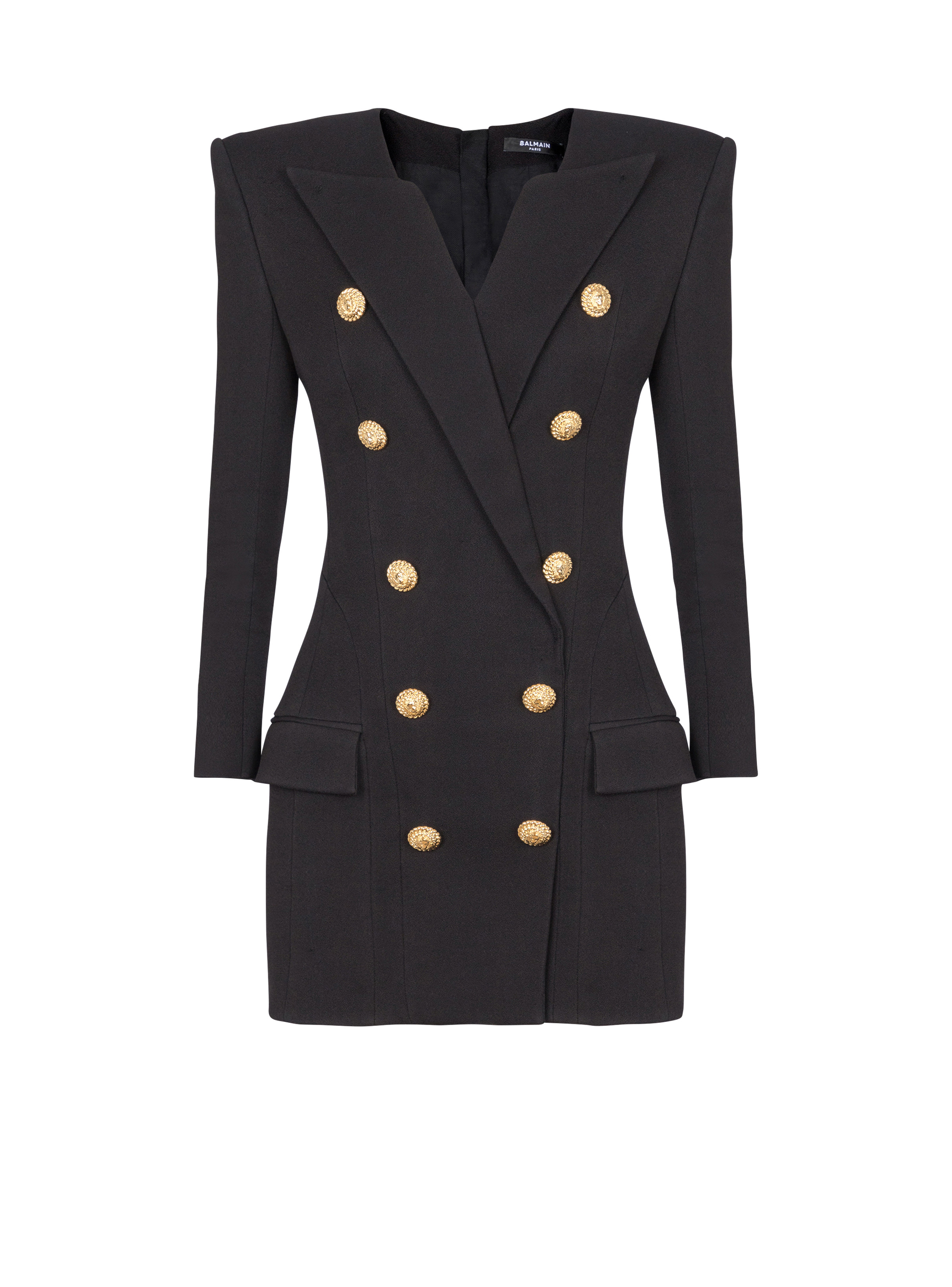 V-neck buttoned crepe short dress - Round neckline with Italian tailored collar - Structured shoulders - Long sleeves - Straight cuffs with 5 covered buttons - Double-breasted button fastening with 10 decorative buttons in golden metal - 2 side slash pockets with flaps - Visible golden metal zip fastening on the back with Balmain Paris-engraved slider - Twill lining - Short slim fit - Model measures 179cm and wears a size 36 - Main material: 100% viscose - Made in Slovakia - Item: EF1R9239VH09
