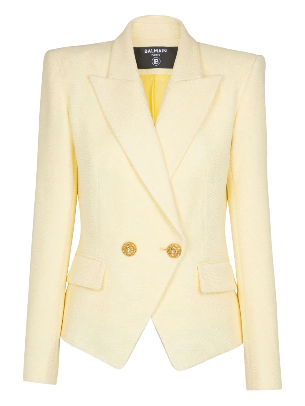 double-button blazer Highlights - Yellow - Double-breasted - Two front pockets - Button fastening - Structured shoulders - Peak lapels Imported Composition Viscose 100% Washing instructions Read Manufacturer Guidelines