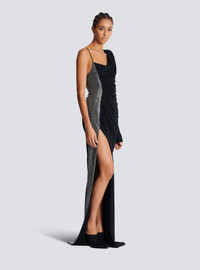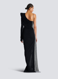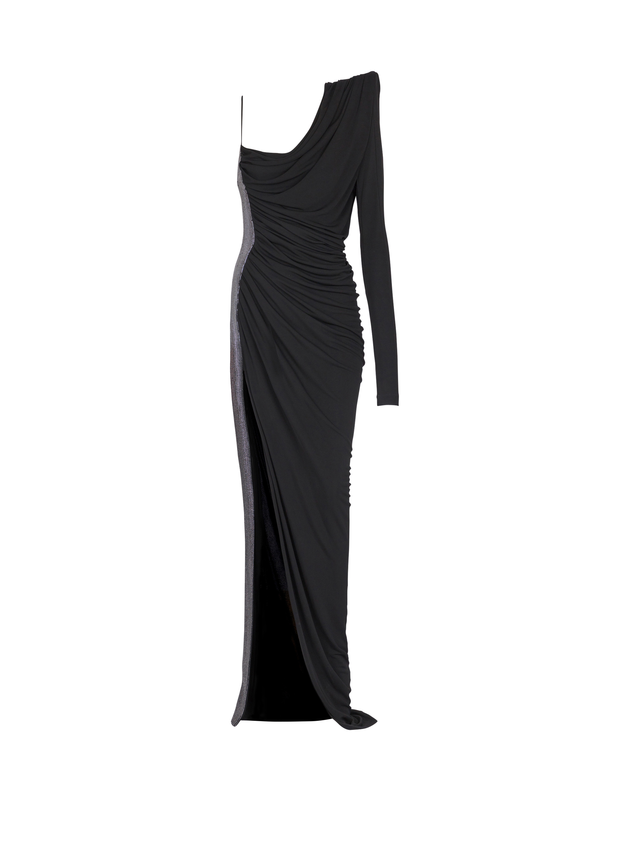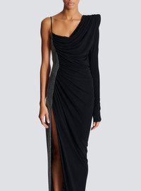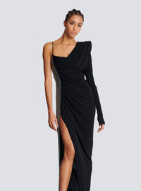 Draped asymmetrical dress in jersey and rhinestones - Pagoda shoulder - Long sleeve - Thin strap - Side panel with rhinestone embellishment - Invisible side zip fastening - Front split - Long, slim fit - Model measures 179cm and wears a size 36 - Main material: 100% viscose - Made in France - Item: EF0RR965PD03100% of the viscose fibres used to make this garment come from certified, sustainably managed forests