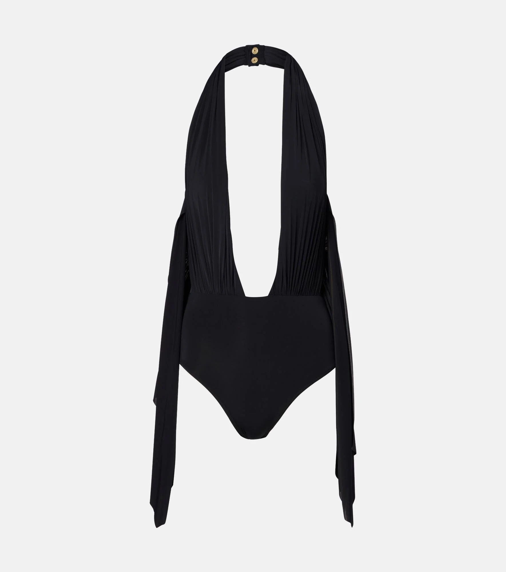 Made in Italy, this swimsuit from Balmain features an alluring plunging neckline and a chic halterneck silhouette. Designed with a draped bodice and self-ties at the sides, this piece adds elegance to any swimwear collection. Product Details - Material: 85% polyamide, 15% elastane - Care instructions: machine wash at 30 degrees - Made in Italy - Designer color name: Black - Item color: black - Lining: 80% polyamide, 20% elastane - Closure: snap-buttoned fastenings, self-ties - Hardware color: gold - Includes: dust bag - Item number: P01066098 Size & Fit - True to size - Petite sizing - Unpadded Top - Medium-cut leg - The model seen in the picture is 178cm-5'10", cup size B, and wearing a size FR 34
