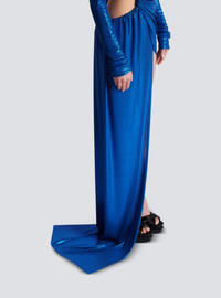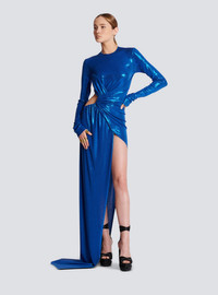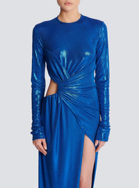 Draped jersey lamé long dress Stretch jersey, round neckline, long sleeves, draped yoke and gathers in front, cut-out on the side revealing the hip, side slit to the top of the thigh Tight fitThis item fits true to size (select your usual size) The model is wearing a size S The model's height is 177 cm/5 ft 9 in, bust 81 cm/32 in, waist 58 cm/23 in and hips 89 cm/35 in Made in FranceMaterials: 92% polyester, 8% elastaneItem: AF1RR321JF33