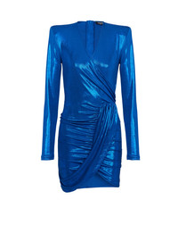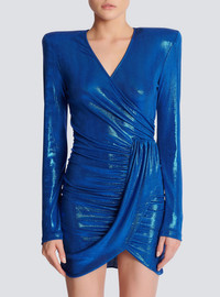 Draped jersey lamé dress Stretch jersey, scooped wrap-over neckline, shoulder pads, draped yoke and gathers on the front, gathers on the hips and back, long sleeves, back zip fastening, visible gold-coloured XL zip Short and tight fitThis item fits true to size (select your usual size) The model is wearing a size S The model's height is 177 cm/5 ft 9 in, bust 81 cm/32 in, waist 58 cm/23 in and hips 89 cm/35 in Made in FranceMaterials: 92% polyester, 8% elastaneItem: AF1R8445JF33
