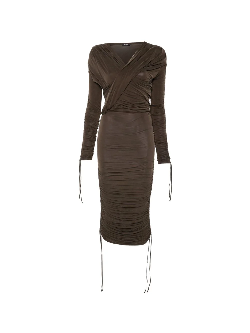 draped midi dress Highlights - Brown - Gathered detailing - Long sleeves - Ties fastening - V-neck - Midi length Made in Italy Composition Cupro 93%, Elastane 7% Washing instructions Dry Clean Only