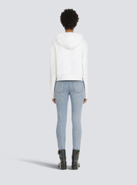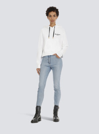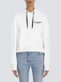 Cropped organically cultivated cotton sweatshirt Long sleeves, drawstring hood, ribbing, flocked white Balmain logoCasual cut Fits true to size, select your usual size The model is wearing FR size 36 The model's height is 177 cm / 5 ft 9 in, bust 81 cm / 32 in, waist 58 cm / 23 in, hips 89 cm / 35 in Made in Portugal Materials: 100% organically cultivated cotton Item: XF0JP000BB01