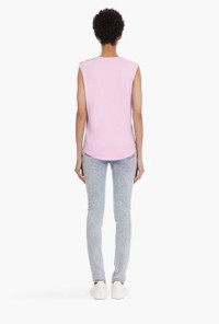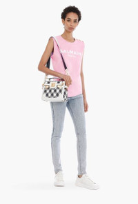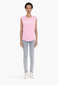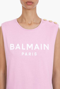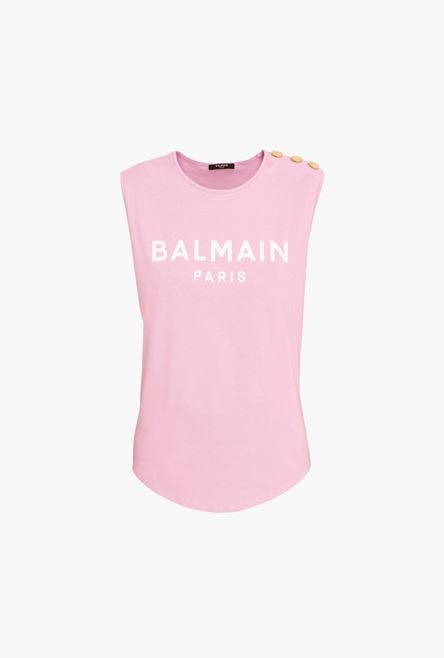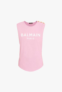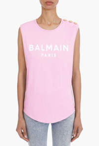 Pink and white cotton T-shirt Sleeveless, embossed gold-tone buttons on shoulder, flocked white Balmain logo ITEM INFORMATION - Relaxed fit - Fits true to size, select your usual size - The model is wearing size FR 36 - The model's height is 180 cm / 5'11 in, bust 80 cm / 31 in, waist 59 cm / 23 in, hips 89 cm / 35 in - Made in Portugal - Material: 100% Cotton - Item: VF11000B012OBR