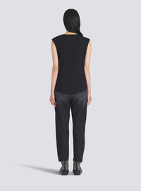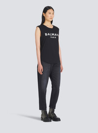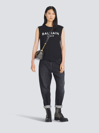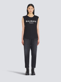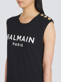 Organically cultivated cotton T-shirt Sleeveless, crew neck, embossed gold-tone buttons on shoulder, white Balmain logo printCasual cut Fits true to size, select your usual size The model is wearing size S The model's height is 177 cm / 5 ft 9 in, bust 81 cm / 32 in, waist 58 cm / 23 in, hips 89 cm / 35 in Made in Portugal Material: 100 % Organically cultivated cotton Item: XF1EB005BB37