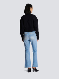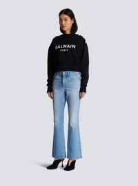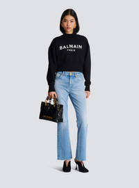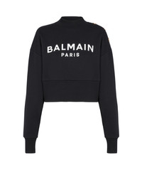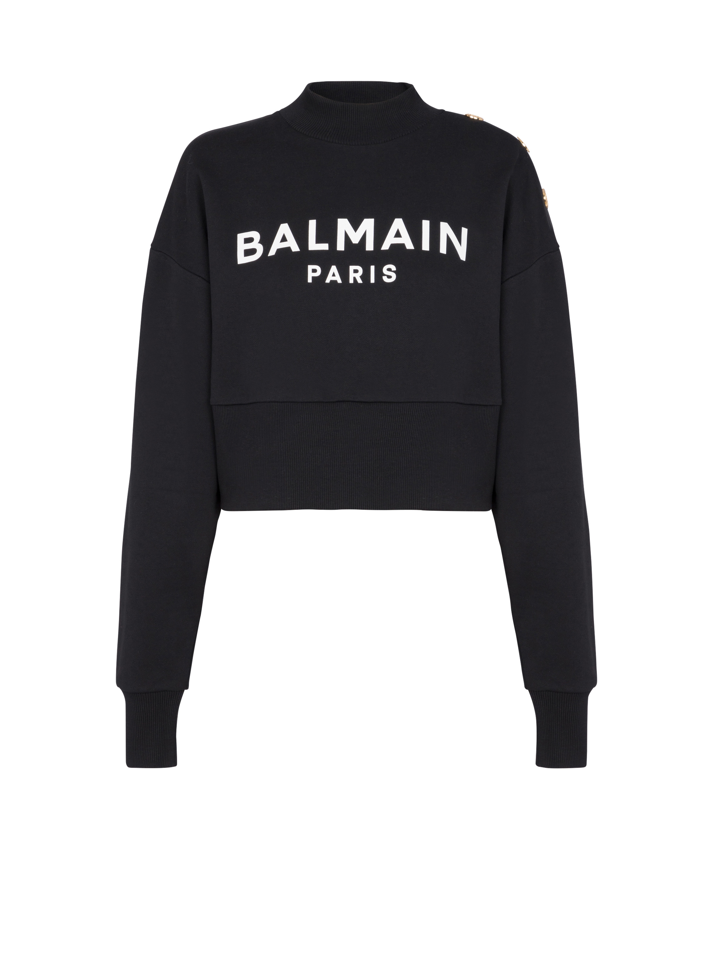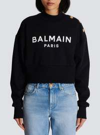 Cropped cotton sweatshirt with printed Balmain logo - Long sleeves - Round neck - Ribbing - Embossed gold buttons on the shoulder - Relaxed fit - Model measures 180cm and wears a size S - Main material: 100% cotton - Made in Portugal - Item: DF1JO040BB02100% of the cotton fibres used to make this garment are certified and organically farmed