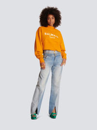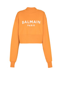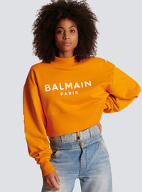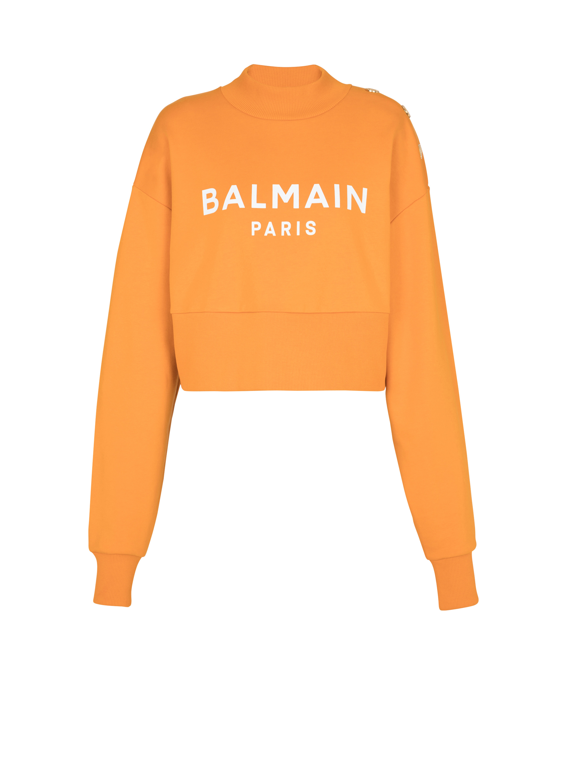 Eco-responsible cotton cropped sweatshirt with Balmain logo print - Long sleeves - round neck - ribbed cuffs and hem - gold embossed buttons on the shoulder - Relaxed fit - This item fits true to size (select your usual size) - The model is wearing a size S - The model's height is 177 cm - Material: 100% organic cotton - Made in Portugal - Item: AF1JO040BB02