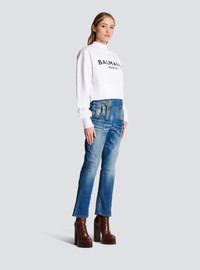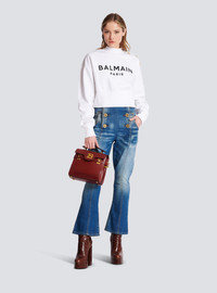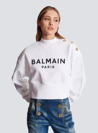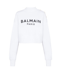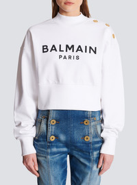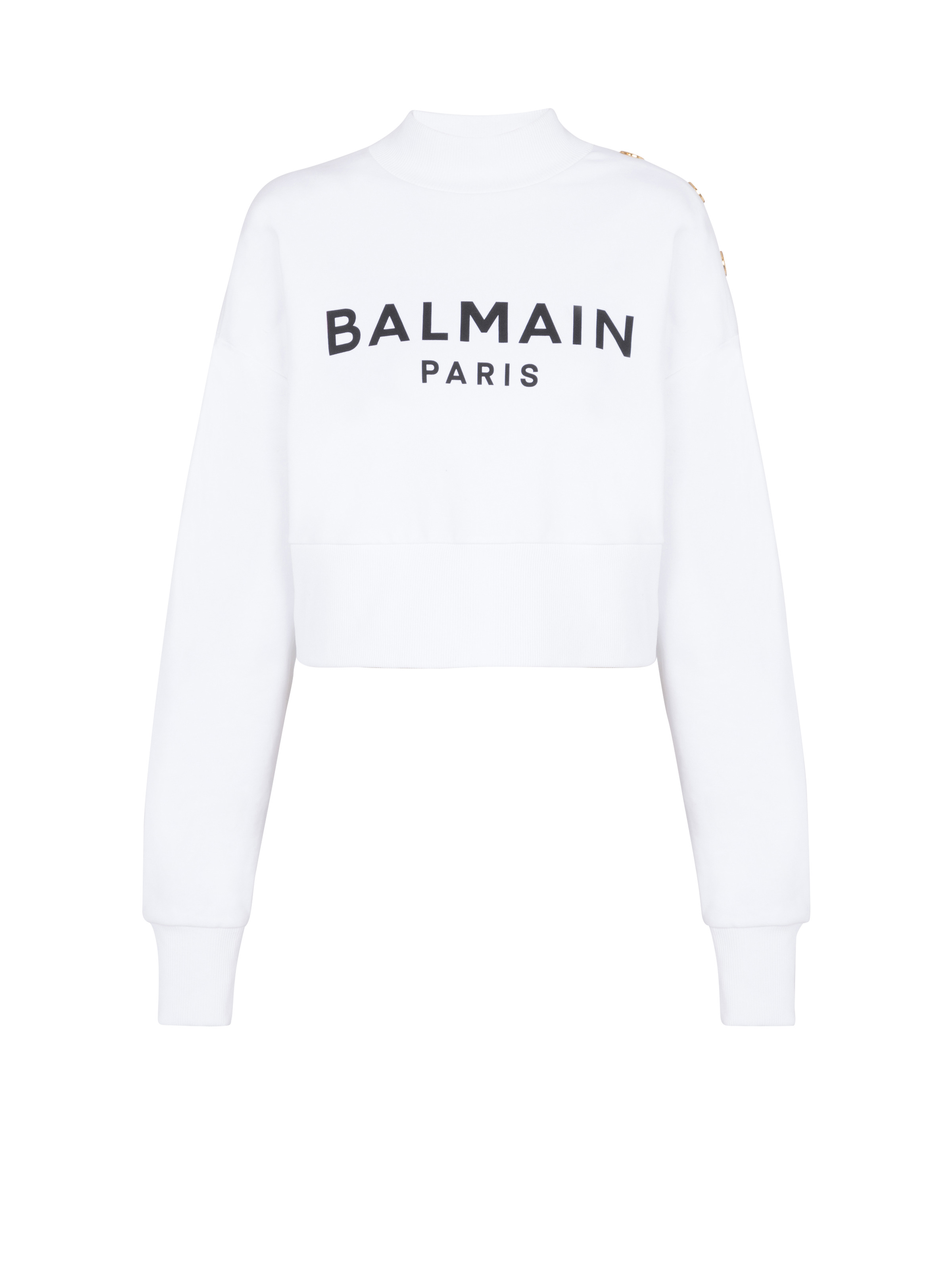 Cropped cotton sweatshirt with printed Balmain logo - Long sleeves - Round neck - Ribbing - Embossed gold buttons on the shoulder - Relaxed fit - Model measures 180cm and wears a size S - Main material: 100% cotton - Made in Portugal - Item: DF1JO040BB02100% of the cotton fibres used to make this garment are certified and organically farmed