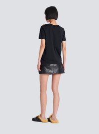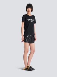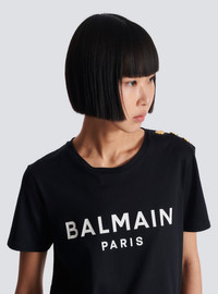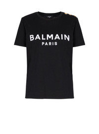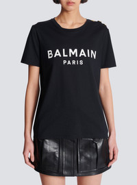 T-shirt with Balmain Paris print - Relaxed fit - Round neck with ribbed trim - 3 decorative embossed gold metal buttons on the shoulder - Short sleeves - Contrasting Balmain Paris logo printed on the front - Model measures 179cm and wears a size S - Main material: 100% cotton - Made in Portugal - Item: BF1EF005BB02100% of the cotton fibres used to make this garment are certified and organically farmed