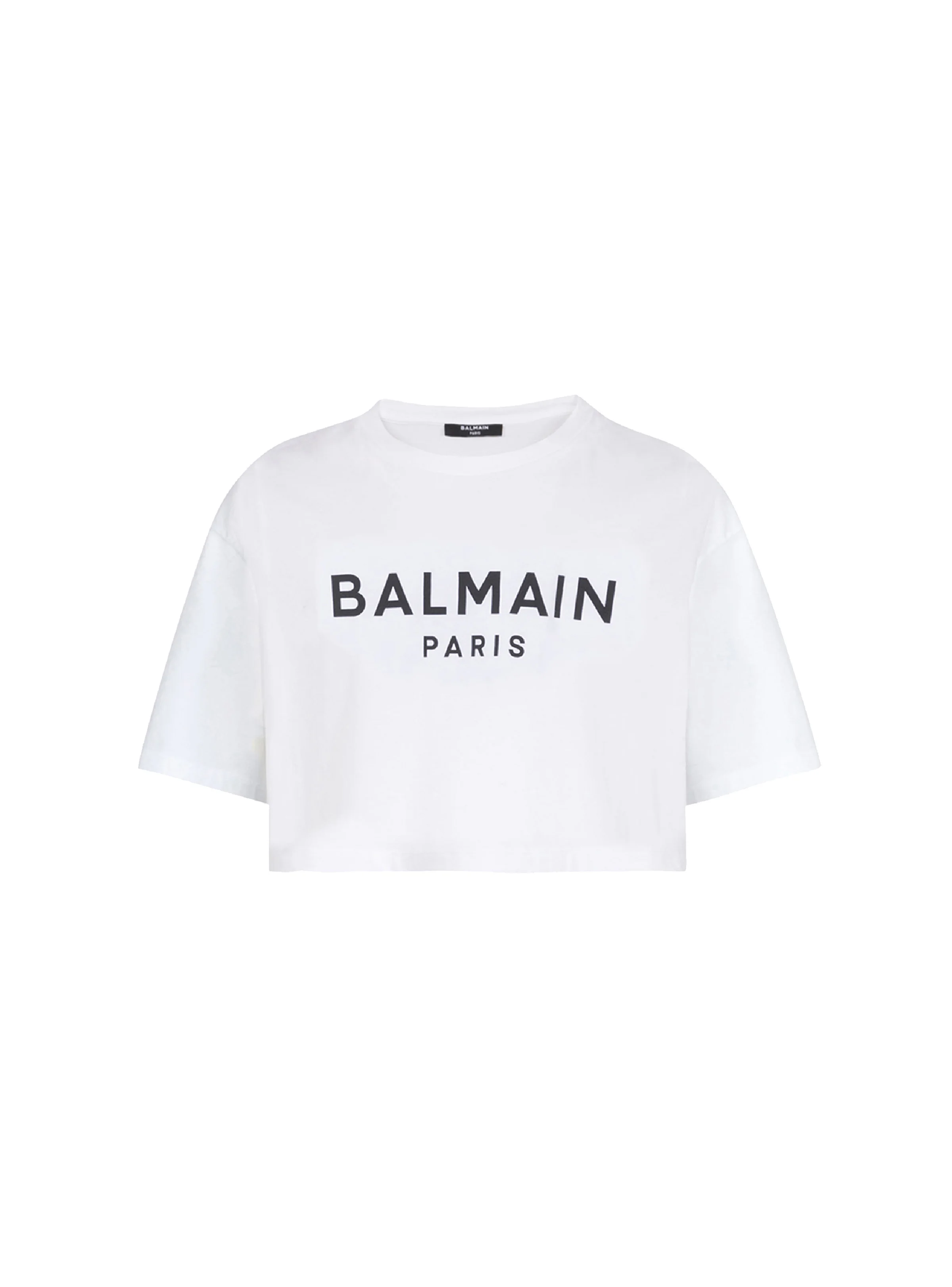 T-shirt with Balmain Paris print - Cropped, relaxed fit - Round neck with ribbed trim - Short sleeves - Contrasting Balmain Paris logo printed on the front - Model measures 180cm and wears a size S - Main material: 100% cotton - Made in Portugal - Item: BF1EE020BB02100% of the cotton fibres used to make this garment are certified and organically farmed