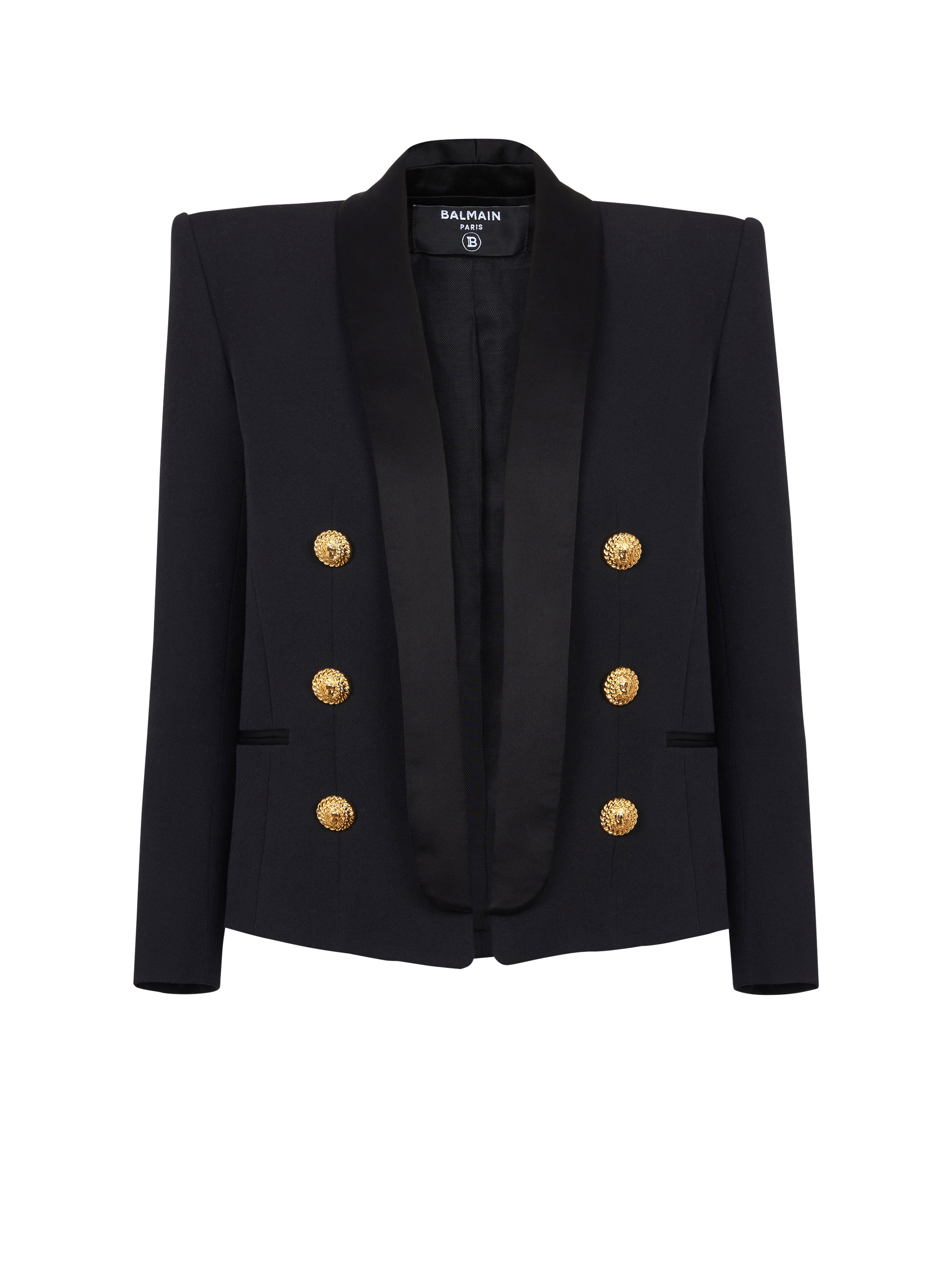 Edge-to-edge 6-button jacket - Cropped fitted cut - Structured shoulders - Shawl collar with satin lapels - Long sleeves - Straight cuffs with 5 buttons - 6 decorative buttons on the front - "Double Chain Lion" buttons in gold metal - 2 welt side pockets - Grain de poudre fabric - Twill lining - Model measures 178cm and wears a size 36 - Main material: 100% wool - Made in Slovakia - Item: DF1SI530ME54100% of the wool fibres used to make this garment are sourced from sheep farms that are certified and animal welfare-friendly