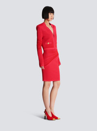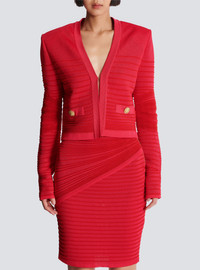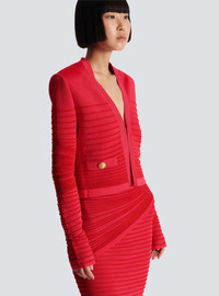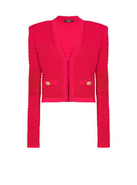 Edge to edge knit cardigan - V-neck collar - Long openwork knit sleeves - Hook fastening - 2 decorative front golden buttons, "Chain Lion Thread" buttons in golden metal - Structured shoulders - Model measures 178cm and wears a size 36 - Main material: 88% viscose 12% polyester - Made in France - Item: EF0SK257KI38