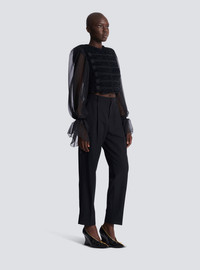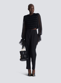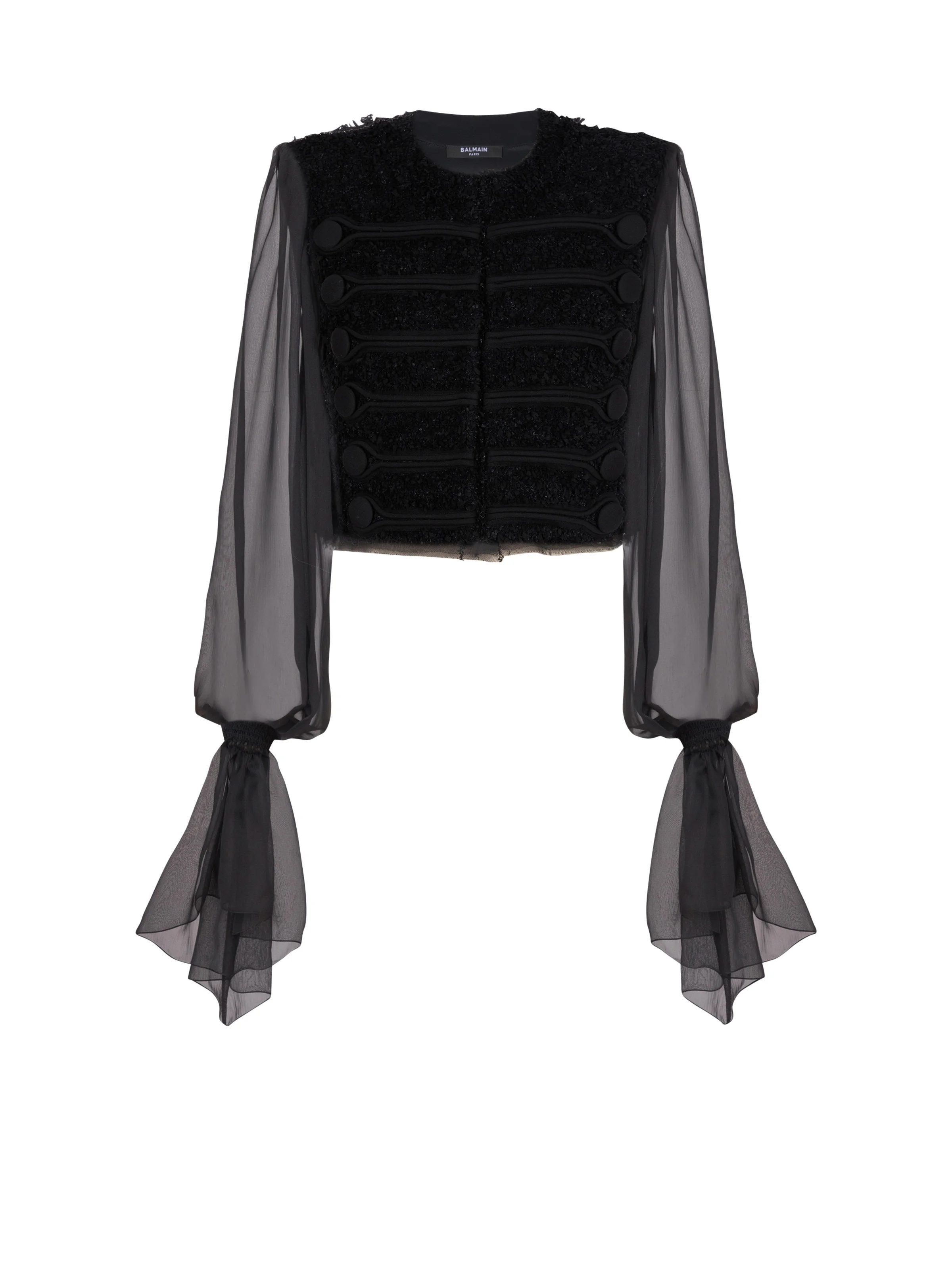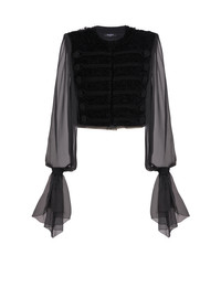 Edge-to-edge tweed and chiffon jacket - Round neckline - Structured shoulders - Long flowing chiffon sleeves - Elasticated cuffs - Frogging with covered buttons, raw edging and textured detailing - Edge-to-edge hook fastening - Raw-edged chiffon trim on the hems - Crepe lining - Straight, cropped fit - Model measures 178cm and wears a size 36 - Main material: 100% silk - Made in Bulgaria - Item: FF1HR140MH42100% of this item’s silk fibres are certified and produced by silkworms