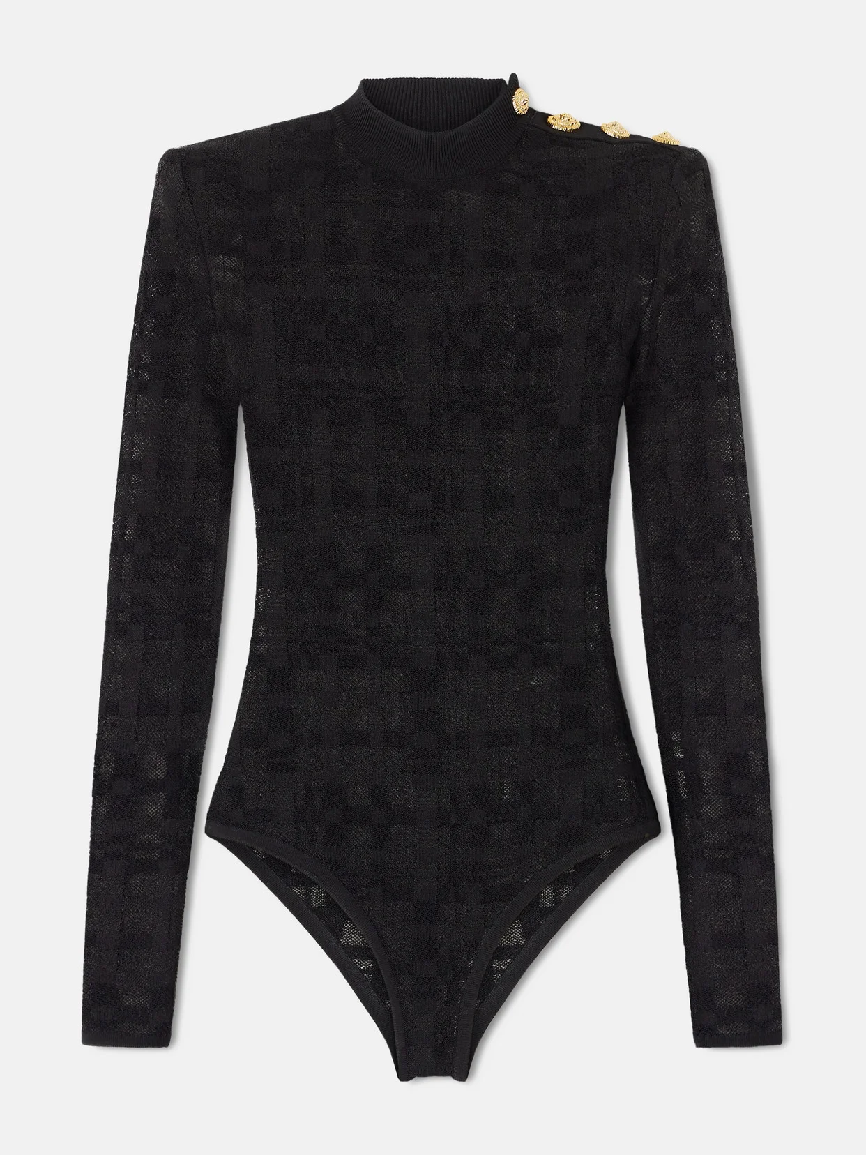 Balmain elevates everyday essentials with its distinctive blend of clean modern lines and effortless Parisian elegance. Knitted with tonal checks, this bodysuit has a ribbed turtleneck and ornate gold-tone buttons along one of the padded shoulders. Wear yours with tailored shorts.