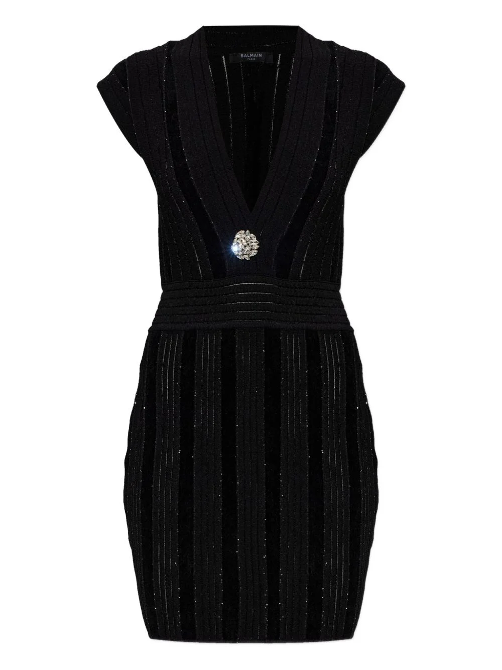 embellished-chest V-neck dress Highlights - Black - Brooch detail - V-neck - Band detail - Vertical stripes - Cap sleeves Made in France Composition Viscose 100% Washing instructions Read Manufacturer Guidelines