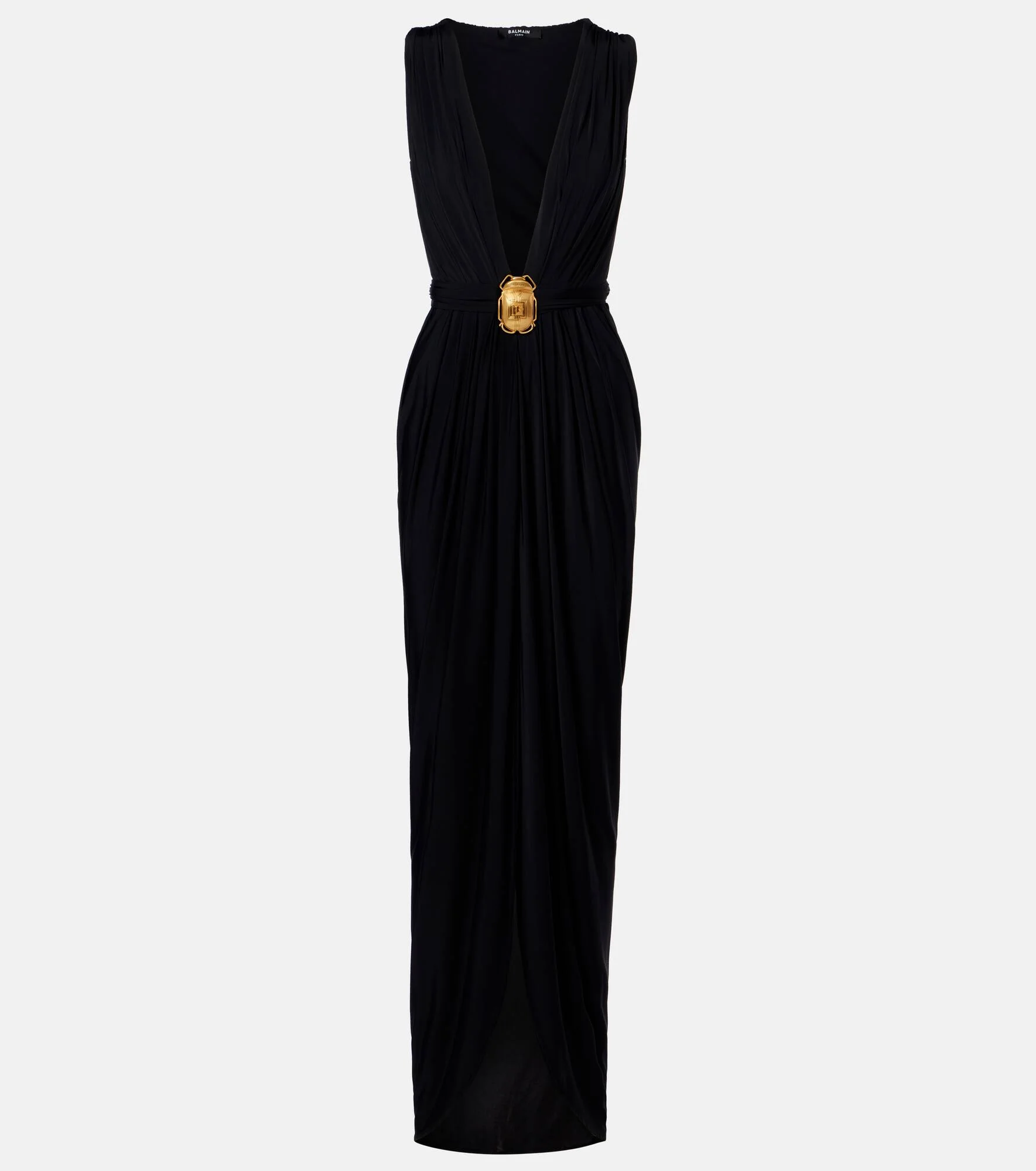 Breathe new life into your wardrobe with Balmain styles that blend the house’s couture heritage with modern aesthetics. This maxi dress is crafted in Italy from black jersey and features a gold-toned embellishment at the peak of its plunging neckline. Product Details - Material: 85% polyamide, 15% elastane - Care instructions: hand wash - Made in Italy - Color: black - Designer color name: Black - Item color: black - Hardware color: gold - Lining: 80% polyamide, 20% elastane - Closure: clip fastening - Item number: P01138699 Size & Fit - True to size - Cinched waist - Stretchy fabric - The model seen in the picture is 178cm-5'10" and wearing a size S