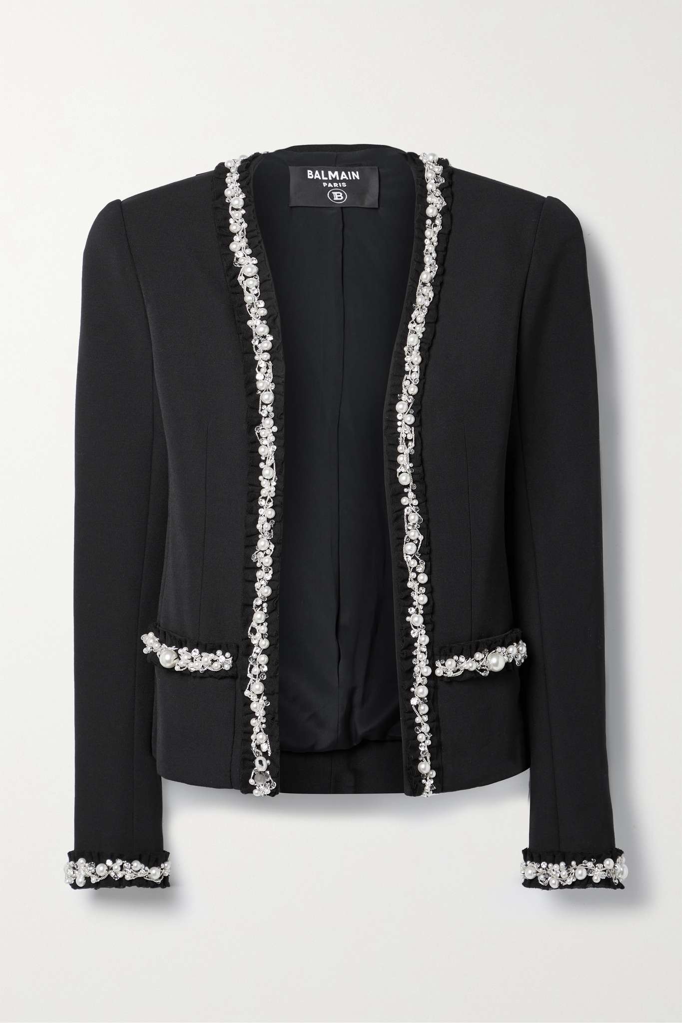 EDITORS'NOTES Balmain's blazer is decorated with chains, crystals, beads and faux pearls that sit atop tonal tulle trims to create a vine-like effect. Made from wool and cotton, it has padded shoulders for structure and an open front that ensures easy layering. Slip it on over a camisole or turtleneck sweater. SIZE & FIT - Fits true to size, take your normal size - Intended for a slim fit - Internal shoulder pads - Mid-weight, heavily embellished, non-stretchy fabric - Model is 177cm/ 5'10" and is wearing a FR 36 DETAILS & CARE - Black wool, cotton and tulle - Slips on - Fabric1: 100% wool; fabric2: 100% cotton; lining: 73% acetate, 27% silk - Specialist clean