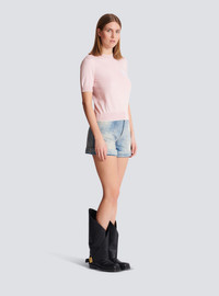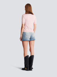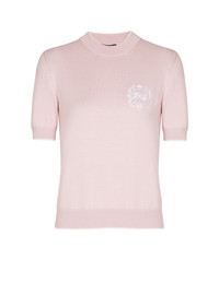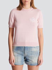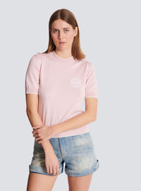 Balmain Embleme-embroidered knit top - Round neckline - Short sleeves - Ribbed trim with contrasting piping - Contrasting Balmain Embleme embroidered on the chest - Fitted cut - Model measures 179cm and wears a size 36 - Main material: 55% silk 45% cotton - Made in Italy - Item: FF1KA115KI86