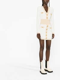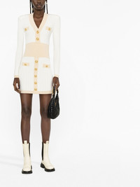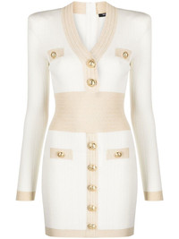 embossed-button knitted minidress Quintessentially Balmain, this dress boasts some of the house's most distinguishing signatures. Starting at the padded shoulders, which lend the knitted design a strong military-inspired silhouette, and finishing with the gold-tone embossed buttons for a touch of refinement. Highlights - White - Ribbed knit - Pointelle knit - Embossed gold-tone buttons - V-neck - Long sleeves - Straight hem Made in Italy Composition Viscose 83%, Polyester 17% SIZE & FIT Model measurements Height 5 ft 10 in(1.79 m) Bust/Chest 31.1 in(79 cm) Hips 35.03 in(89 cm) Waist 24.01 in(61 cm) FittingInformation This piece fits true to size. We recommend you get your regular size Cut for a slim fit Made with a mid-weight fabric Washing instructions Dry Clean Only