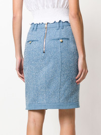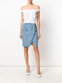 embossed-button skirt Olivier Rousteing continues his evolution of Balmain’s classic styles into the brand’s SS18 collection and beyond. Equal amounts decorative, daring and refined, these garments are an elevation of Parisian craftsmanship. Crafted in Italy, this embossed-button skirt features a high waist, gold-tone embossed buttons, a front button fastening, a waistband with belt loops, a wrap style front and a mid-length. Made in Italy Composition Outer: Cotton 98%, Polyurethane 2% Lining: Viscose 52%, Cotton 48% SIZE & FIT Model measurements Height 5 ft 11 in(1.8 m) Bust/Chest 33.85 in(86 cm) Hips 35.03 in(89 cm) Waist 24.8 in(63 cm)
