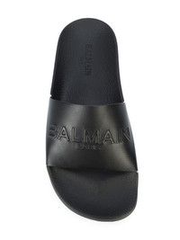 embossed logo slides Olivier Rousteing continues to introduce his youthful energy to classic silhouettes for Balmain’s Spring/Summer '18 collection. Expect expert craftsmanship and premium materials blended with sports-inspired elements and a contemporary finish. These bBlack leather embossed logo slides from Balmain feature an open toe, a front embossed logo stamp, a branded insole and a flat sole. Made in Italy Composition Outer: Calf Leather 100% SIZE & FIT Measurement HEEL 1.14 in(2.9 cm)