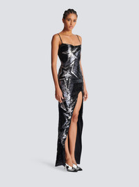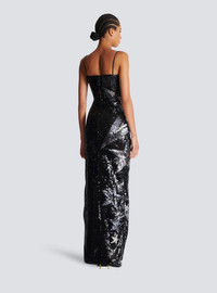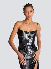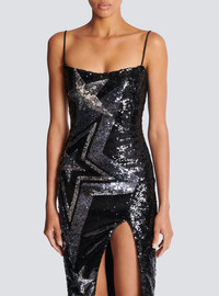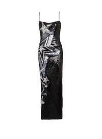 Fully sequin-embroidered maxi dress - Embroidered stars pattern - Slim fit, front slit - Narrow straps - Fastening with black metal zip at the back - Model measures 179cm and wears a size 36 - Main material: 88% polyamide 12% elastane - Made in India - Item: CF1RN113PC22