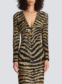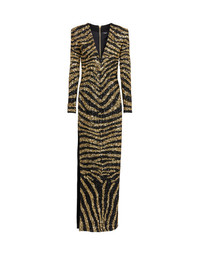 <p>Long dress entirely embroidered with a zebra motif</p><ul><li>Two-tone embroidery with black and gold sequins</li><li> scooped neckline</li><li> shoulder pads</li><li> long sleeves</li><li> side slit to the top of the thigh</li><li> back zip fastening</li><li> visible gold-coloured XL zip</li><li> Tight fit</li><li>This item fits true to size (select your usual size) </li><li> The model is wearing a size S </li><li> The model's height is 177 cm </li><li> Materials: 97% polyamide, 3% elastane</li><li>Made in India</li><li>Item: AF1RR181PB60</li></ul>
