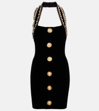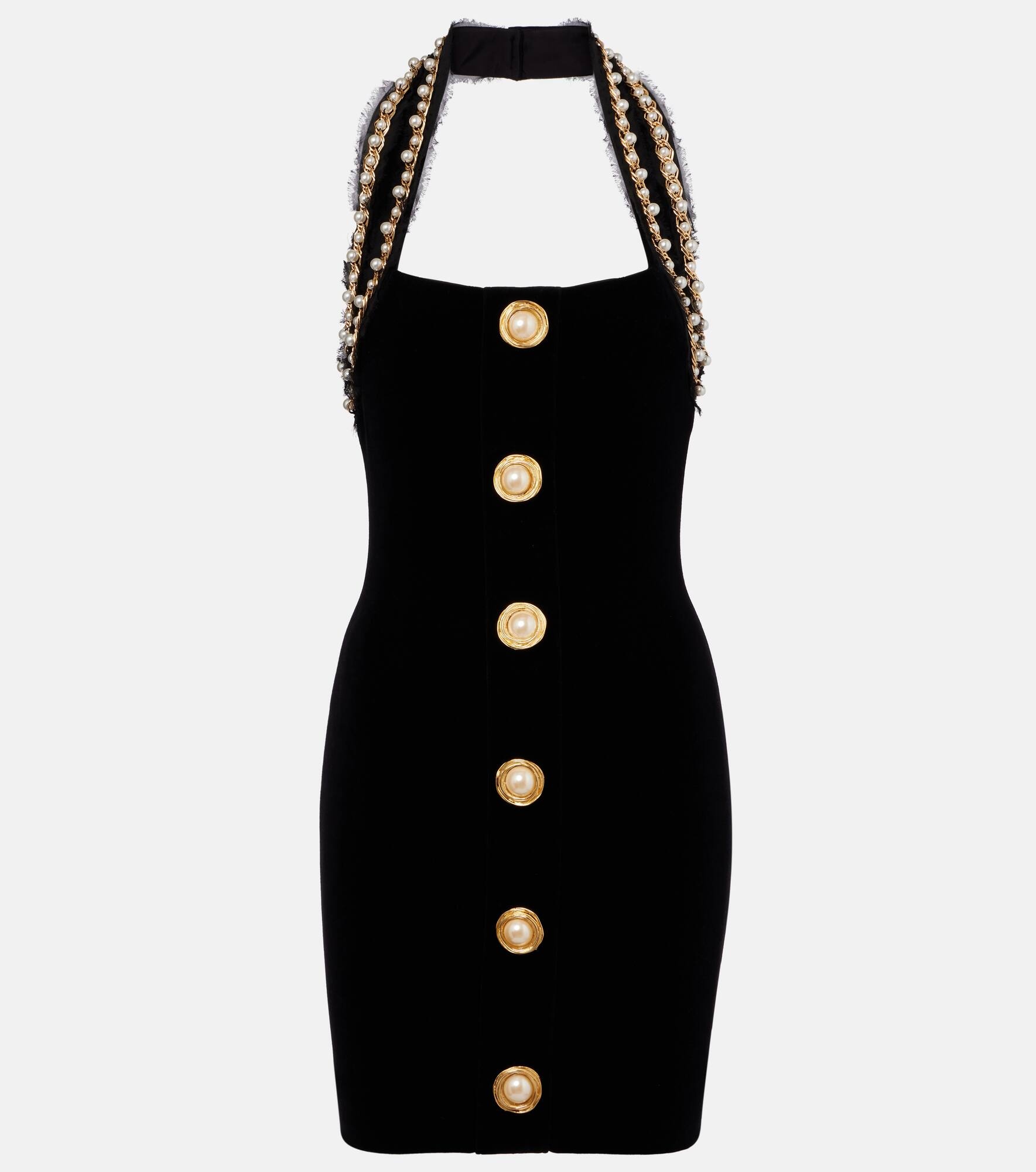 Olivier Rousteing breathes new life into Balmain, respecting the house’s couture heritage with modern relevance. This minidress is made from cotton-blend velvet, embellished with faux pearls along its halterneck. Product Details - Material: 80% cotton, 20% polyester - Care instructions: dry clean - Made in France - Designer color name: Noir/Or/Blanc - Item color: black - Lining: 95% polyester, 5% elastane - Closure: zipped back - Item number: P01026119 Size & Fit - True to size - Low back - Fitted - Stretchy fabric - The model seen in the picture is 178cm-5'10" and wearing a size FR 34