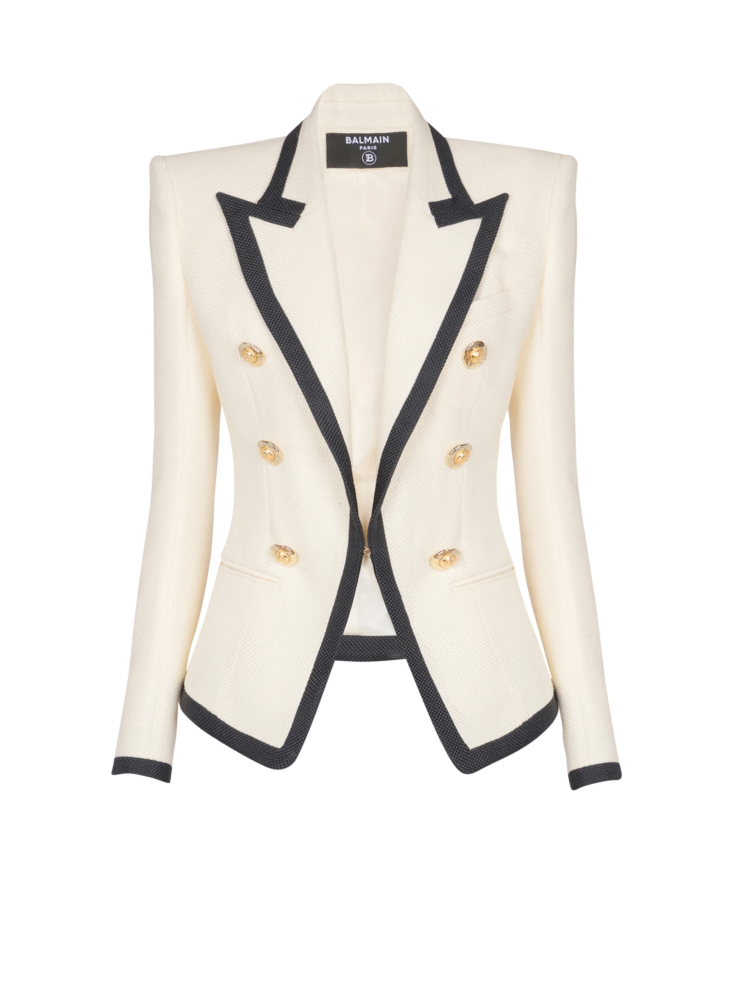 Fitted two-tone basketweave jacket - Italian tailored collar - Structured shoulders - Long sleeves - Straight cuffs with 5 golden metal ‘Coin’ buttons - 1 breast pocket - Invisible hook fastening - 6 decorative "Gold and Gold Coin" buttons on the front - 2 slash side pockets - Contrasting trim - Inside slash pocket - Twill lining - Tailored fit, defined waist - Model measures 178cm and wears a size 36 - Main material: 77% viscose 23% cotton - Made in France - Item: FF1SE165VI29