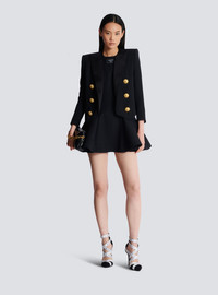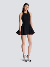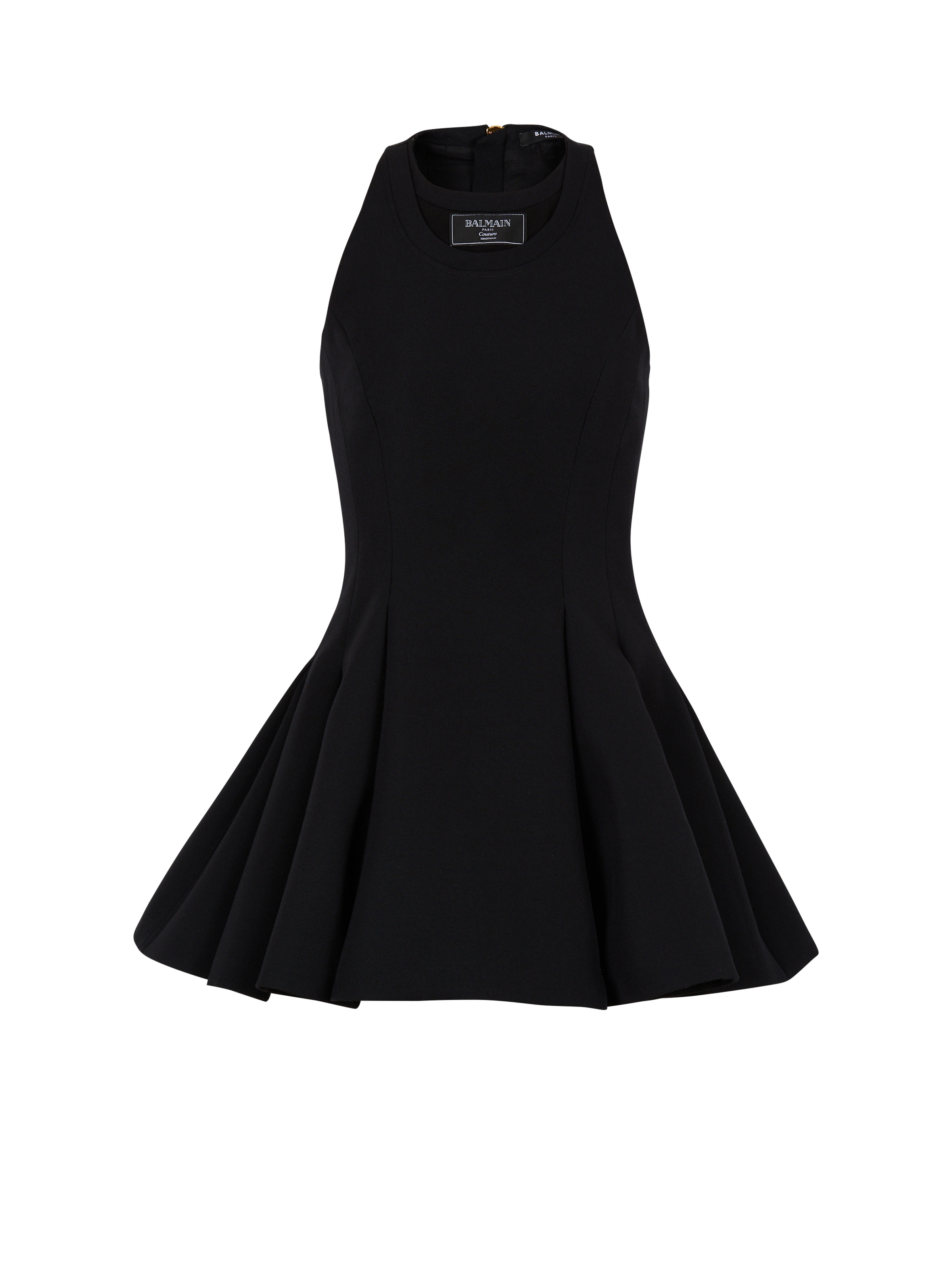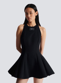 Flared pleated plain grain de poudre dress - Halter neckline - Double neckline effect - Woven Balmain Couture label on the front - Sleeveless - Visible gold metal zip fastening on the back with Balmain Paris-engraved slider - Twill lining - Short, flared cut - Model measures 179cm and wears a size 36 - Main material: 100% wool - Made in Poland - Item: EF1R5087ME54100% of the wool fibres used to make this garment are sourced from sheep farms that are certified and animal welfare-friendly