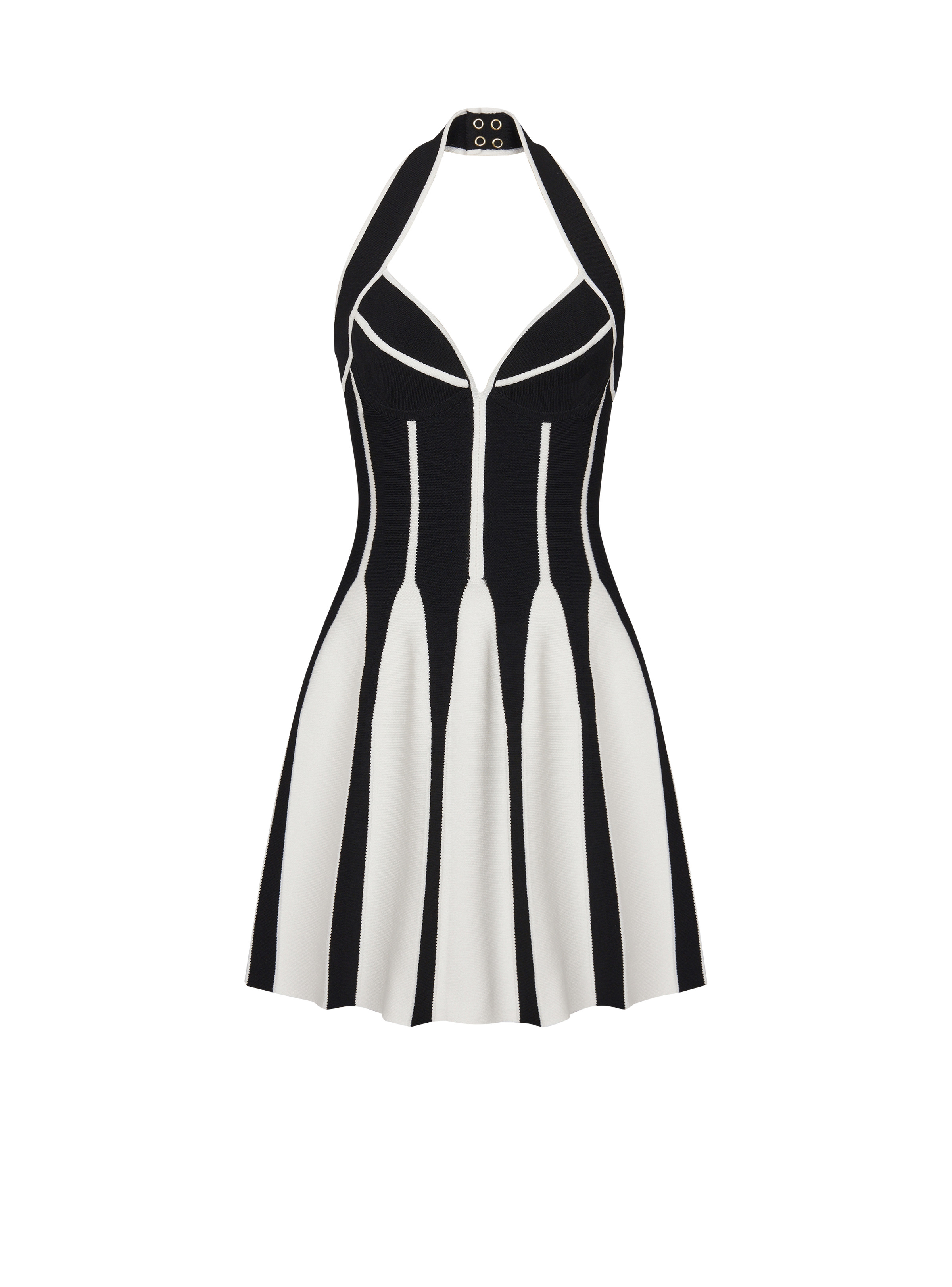 Flared halterneck knit dress - Short flared cut - Sweetheart neckline - Fastening at the neck with 4 "Double Chain Lion" press studs in gold metal - Visible metal zip fastening on the back with Balmain-engraved slider - Two-tone knit - Model measures 178cm and wears a size 36 - Main material: 88% viscose 12% polyester - Made in Italy - Item: DF1R5056KG57100% of the viscose fibres used to make this garment come from certified, sustainably managed forests