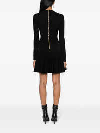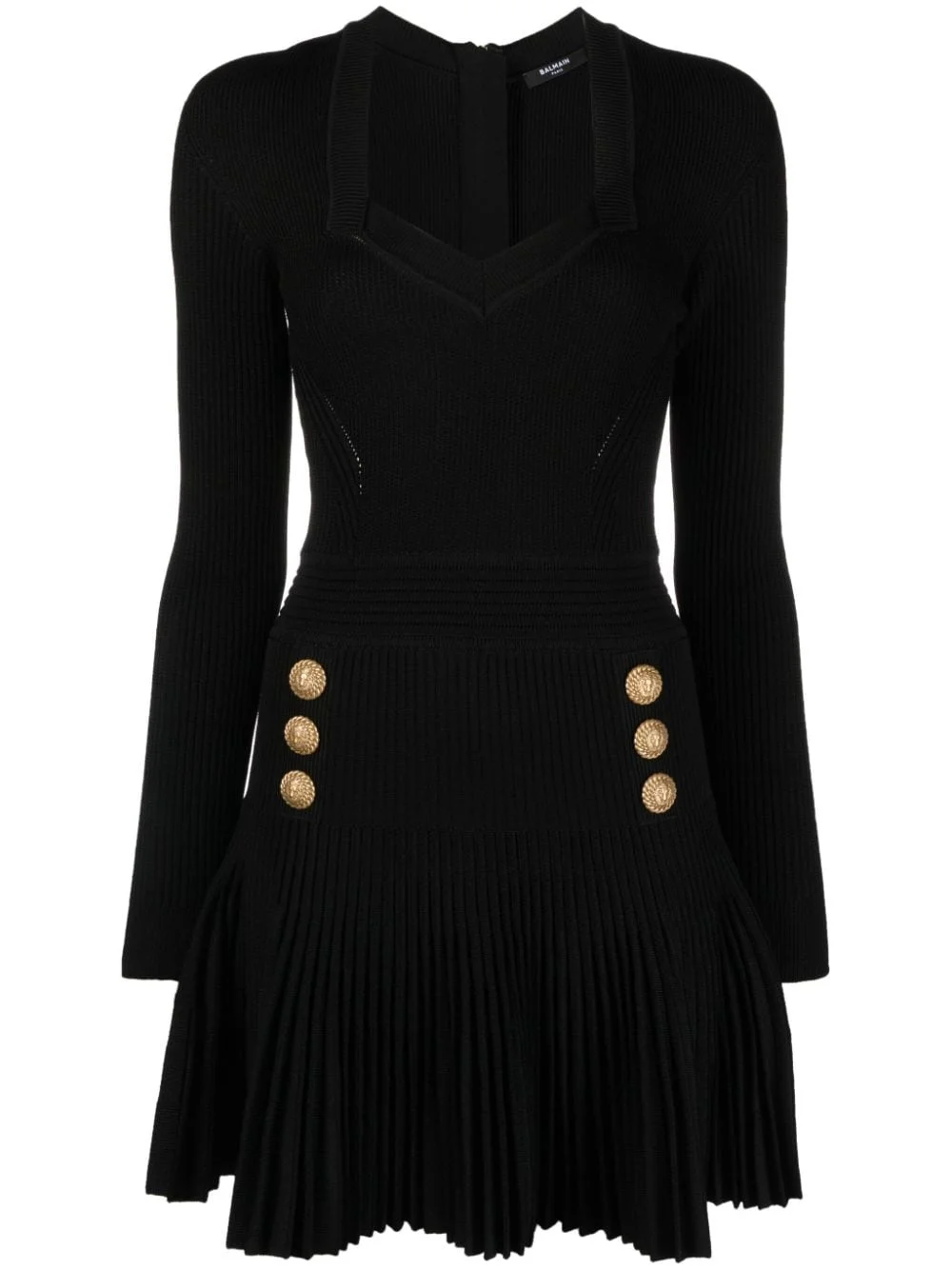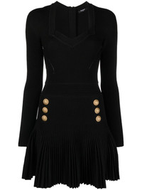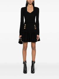 flared ribbed-knit dress Boasting a ribbed-knit construction, this black Balmain minidress is cut to a preppy silhouette with a pleated flared skirt, lending movement. It is punctuated by gold-tone buttons embossed with a signature lion head motif, reflecting the brand's affinity for metallic accents. Highlights - Black - Ribbed knit - Embossed gold-tone buttons - Lion head motif - V-neck - Rear zip fastening - Long sleeves - Flared skirt - Pleated skirt - Above-knee length - Straight hem Made in Italy Composition Viscose 84%, Polyester 16% SIZE & FIT Model measurements Height 5 ft 10 in(1.77 m) Bust/Chest 31.1 in(79 cm) Hips 34.64 in(88 cm) Waist 24.8 in(63 cm) FittingInformation Designed for a close fit throughout Made with a midweight knit, this piece offers some stretch This piece fits true to size – take your usual size Washing instructions Dry Clean Only