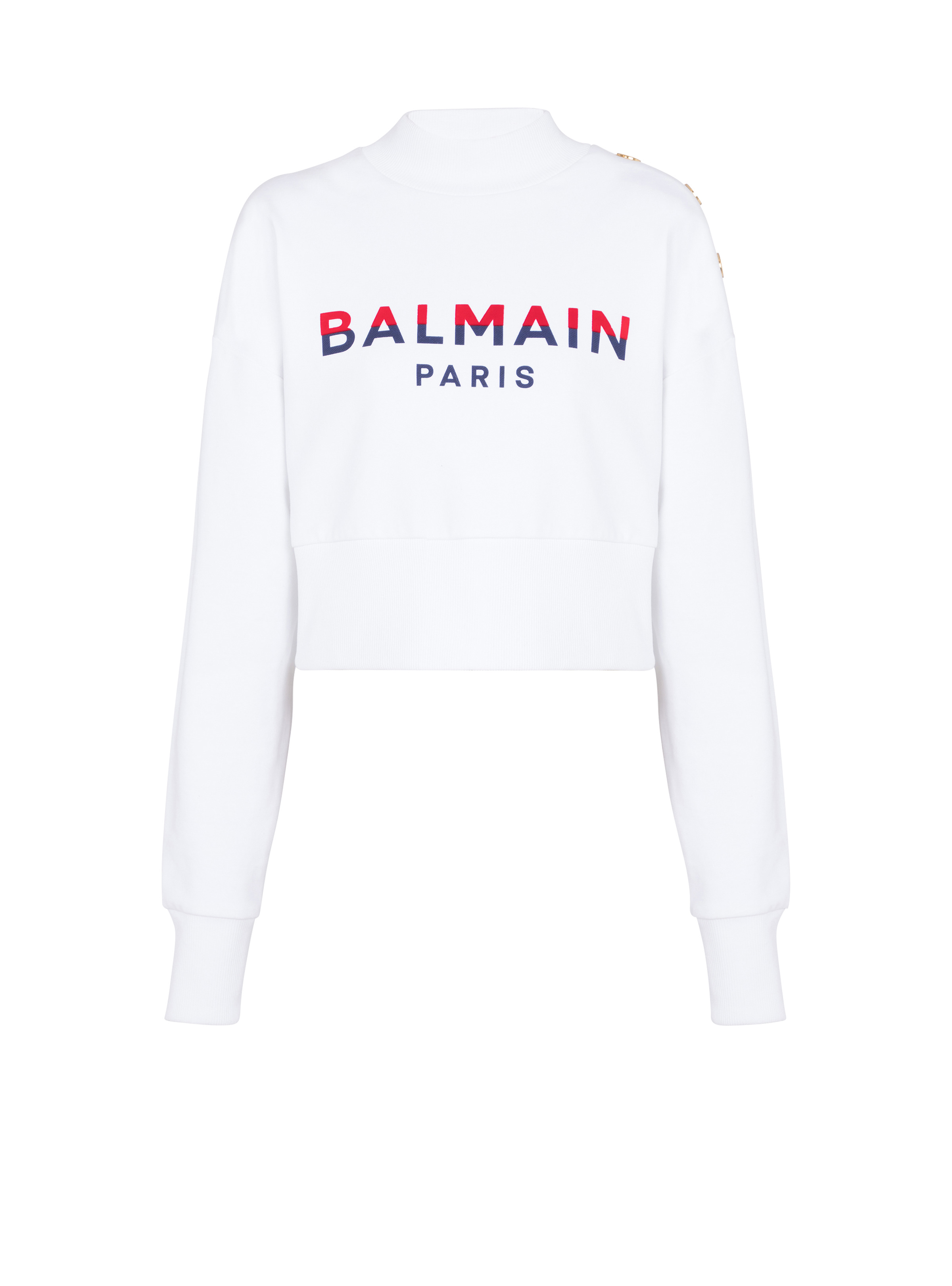 Sweatshirt with flocked two-tone Balmain Paris detail - Short cut - Round neckline - Long sleeves - 3 decorative golden metal 'Coin' buttons on the shoulder - Ribbed edging - Model measures 175cm and wears a size S - Main material: 100% certified organic cotton - Made in Portugal - Item: BF1JO040BC46