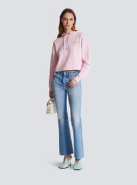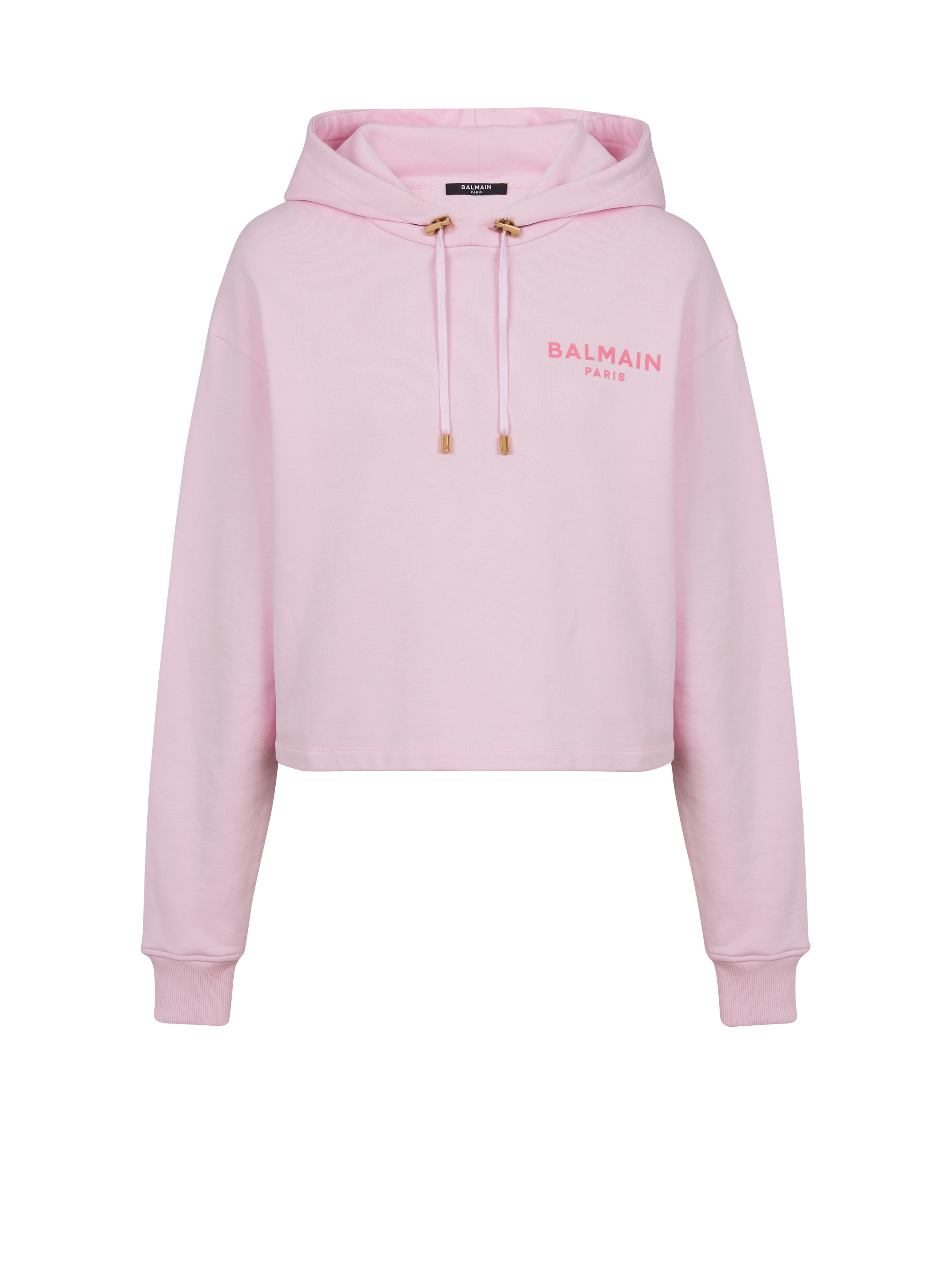 Balmain Paris hoodie - Contrasting flocked Balmain Paris logo on the front - Cropped fit - Round neck - Long sleeves - Drawstring-adjustable hood - Gold metal aglets, stoppers and eyelets - Ribbed edging - Model measures 180cm and wears a size S - Main material: 100% cotton - Made in Portugal - Item: DF1JP040BB01100% of the cotton fibres used to make this garment are certified and organically farmed