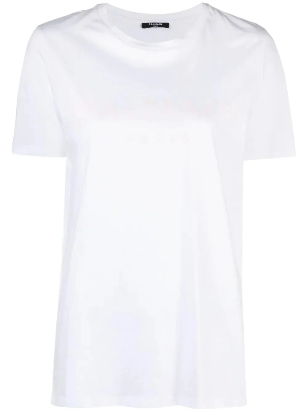flocked logo T-shirt Olivier Rousteing elevates a cult classic in this version of Balmain’s iconic logo T-shirt. Cut from white cotton, this crew-neck tee is flocked with the brand's logo. Highlights - White - Organic cotton - Flocked logo - Crew neck - Short sleeves - Straight hem Imported Composition Organic Cotton 100% Washing instructions Machine Wash