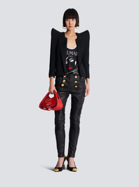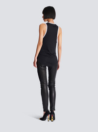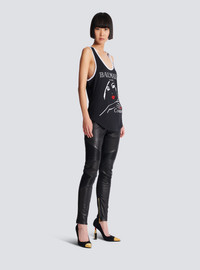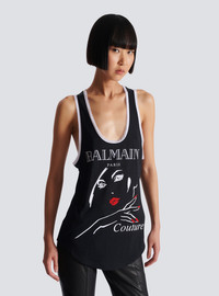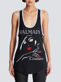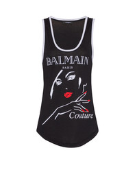 Relaxed flocked jersey tank top with Balmain Beauty print - Round neckline - Flocked Balmain Beauty design on the front - Balmain Couture logo integrated into the design - Contrasting chiffon trim - Rounded hem - Relaxed fit - Model measures 178cm and wears a size S - Main material: 67% lyocell 33% cotton - Made in Portugal - Item: EF0EB054GE88