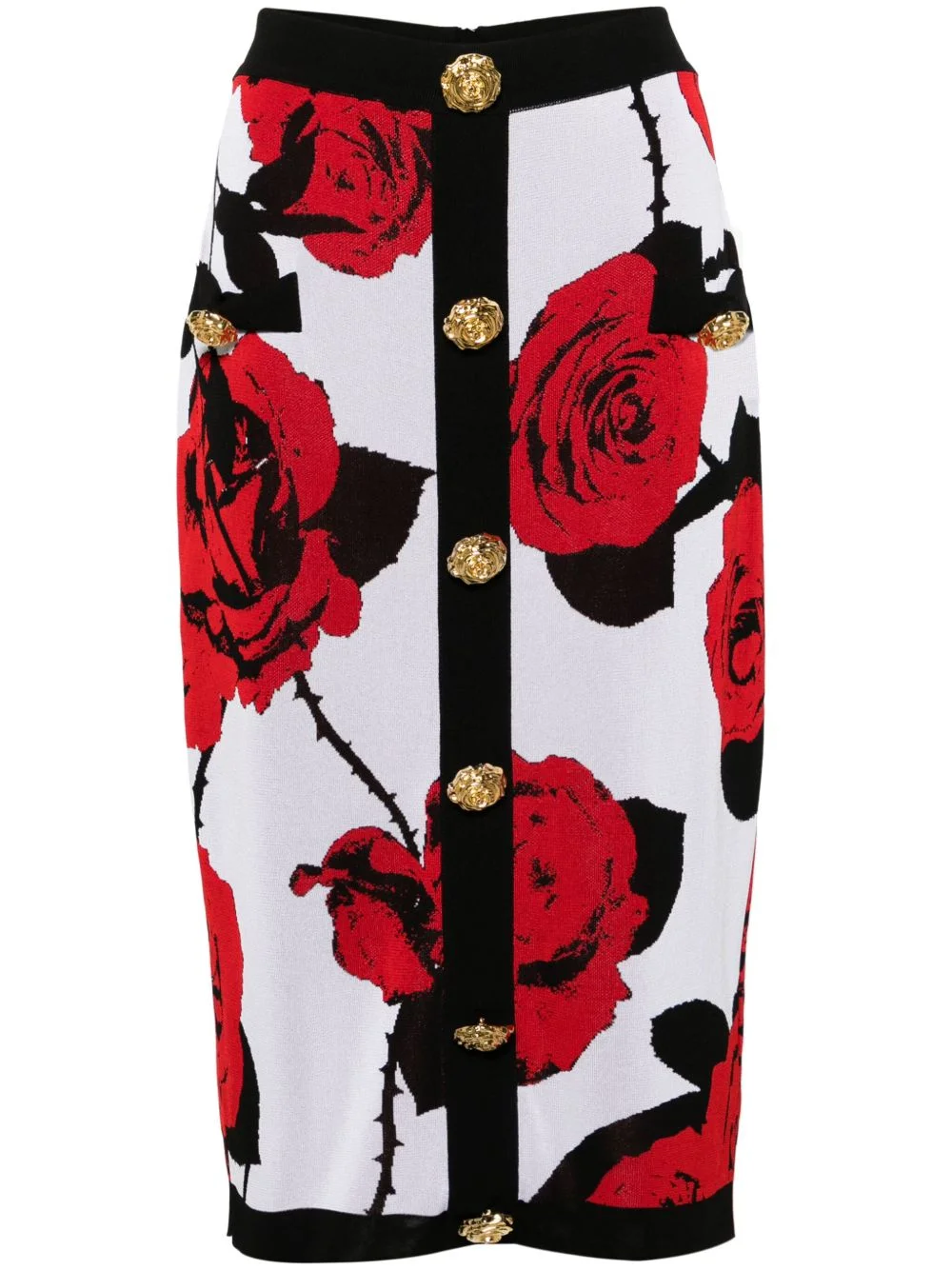 floral-jacquard midi skirt A sartorial ode Pierre Balmain’s love of flowers, this compact-knit pencil skirt is woven with red roses and dotted with matching gold-tone buttons throug the front. Highlights - White/black/red - Knitted construction - Floral jacquard - High waist - Decorative gold-tone rose buttons - Faux pocket detail - Contrasting ribbed trim - Pencil silhouette - Below-knee length - Unlined - Rear zip fastening Made in France Composition Viscose 73%, Polyamide 27% SIZE & FIT Model measurements Height 5 ft 9 in(1.76 m) Bust/Chest 31.1 in(79 cm) Hips 36.61 in(93 cm) Waist 24.8 in(63 cm) FittingInformation Made with a midweight knit, this piece offers some stretch