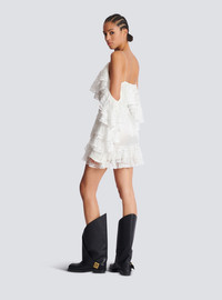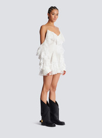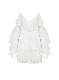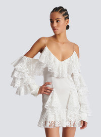Flowing satin dress with lace ruffles - Thin straps - V-neckline - Sleeveless - Long sleeves - Straight cuffs with 4 satin-covered buttons - Back fastening with invisible zip and hook - Cropped cut with fitted waist - Model measures 179cm and wears a size 36 - Main material: 100% silk - Made in France - Item: FF1R2450MH29