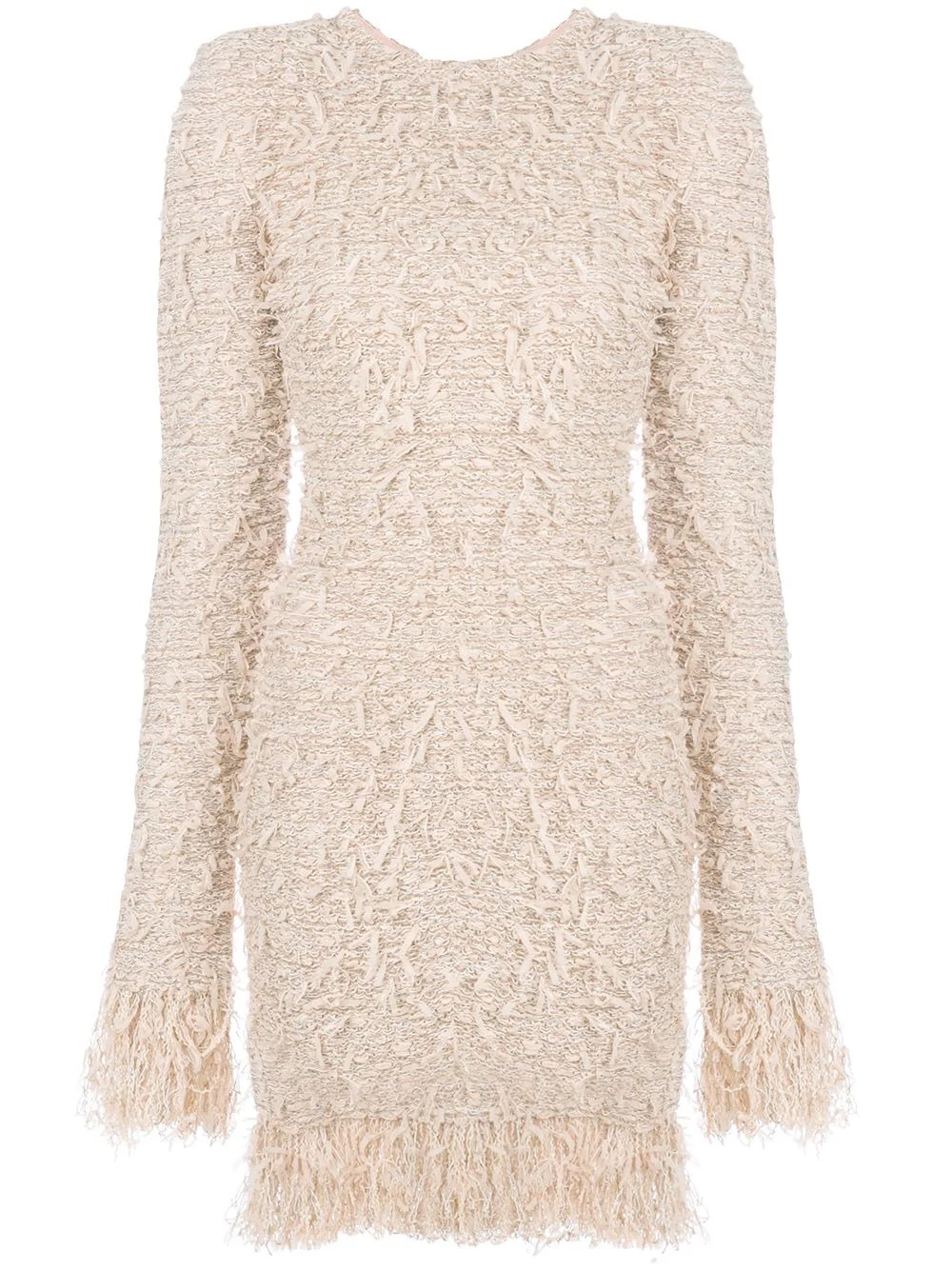 frayed fitted dress Despite his innovative evolution of the brand, Olivier Rousteing does not shy away from Balmain's unmissable classics that truly define the fashion house. Crafted from nude pink cotton, this frayed fitted dress is the ideal way to infuse some luxury into your life. Stylish yet comfortable, it features a round neck, structured shoulders, long sleeves, frayed edges and a short length. Imported Composition Polyimide 53%, Cotton 31%, Acrylic 14%, Spandex/Elastane 1%, Metal 1% SIZE & FIT Model measurements Height 5 ft 11 in(1.81 m) Bust/Chest 32.28 in(82 cm) Hips 34.64 in(88 cm) Waist 24.01 in(61 cm) Washing instructions Dry Clean Only