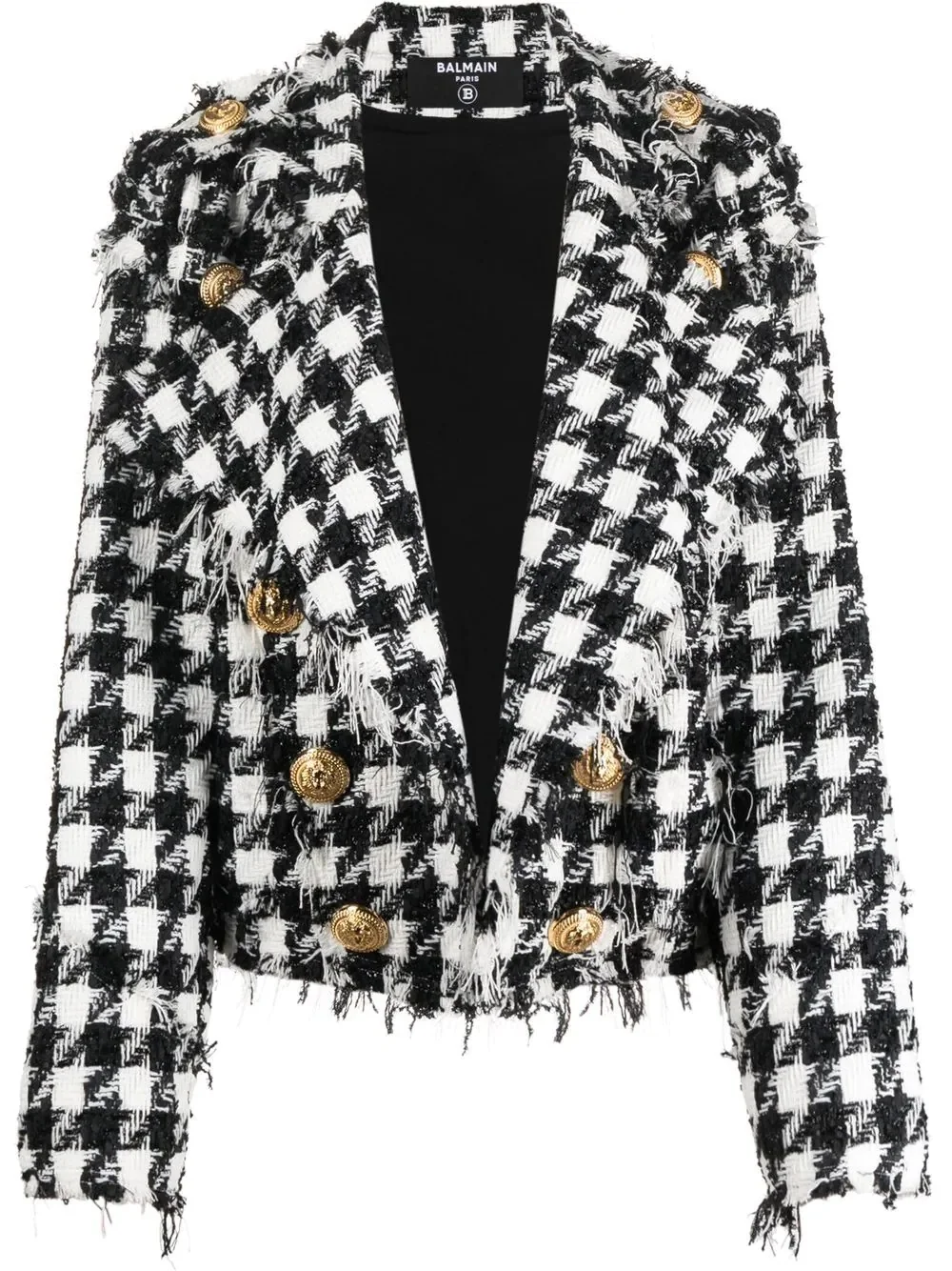frayed tweed jacket Balmain adds a contemporary twist to a wardrobe staple in this tweed jacket. It features all-over frayed detailing a cropped length, imbuing the design with a modern flair. Imported Composition Outer: Polyamide 59%, Wool 14%, Polyester 14%, Cotton 6% Lining: Viscose 52%, Cotton 48% SIZE & FIT Model measurements Height 5 ft 10 in(1.78 m) Bust/Chest 31.49 in(80 cm) Hips 35.43 in(90 cm) Waist 24.4 in(62 cm) FittingInformation This piece fits true to size. We recommend you get your regular size Cut for a loose fit Made with a mid-weight non-stretch fabric Washing instructions Dry Clean Only