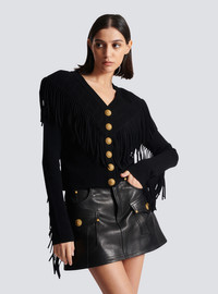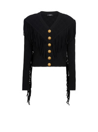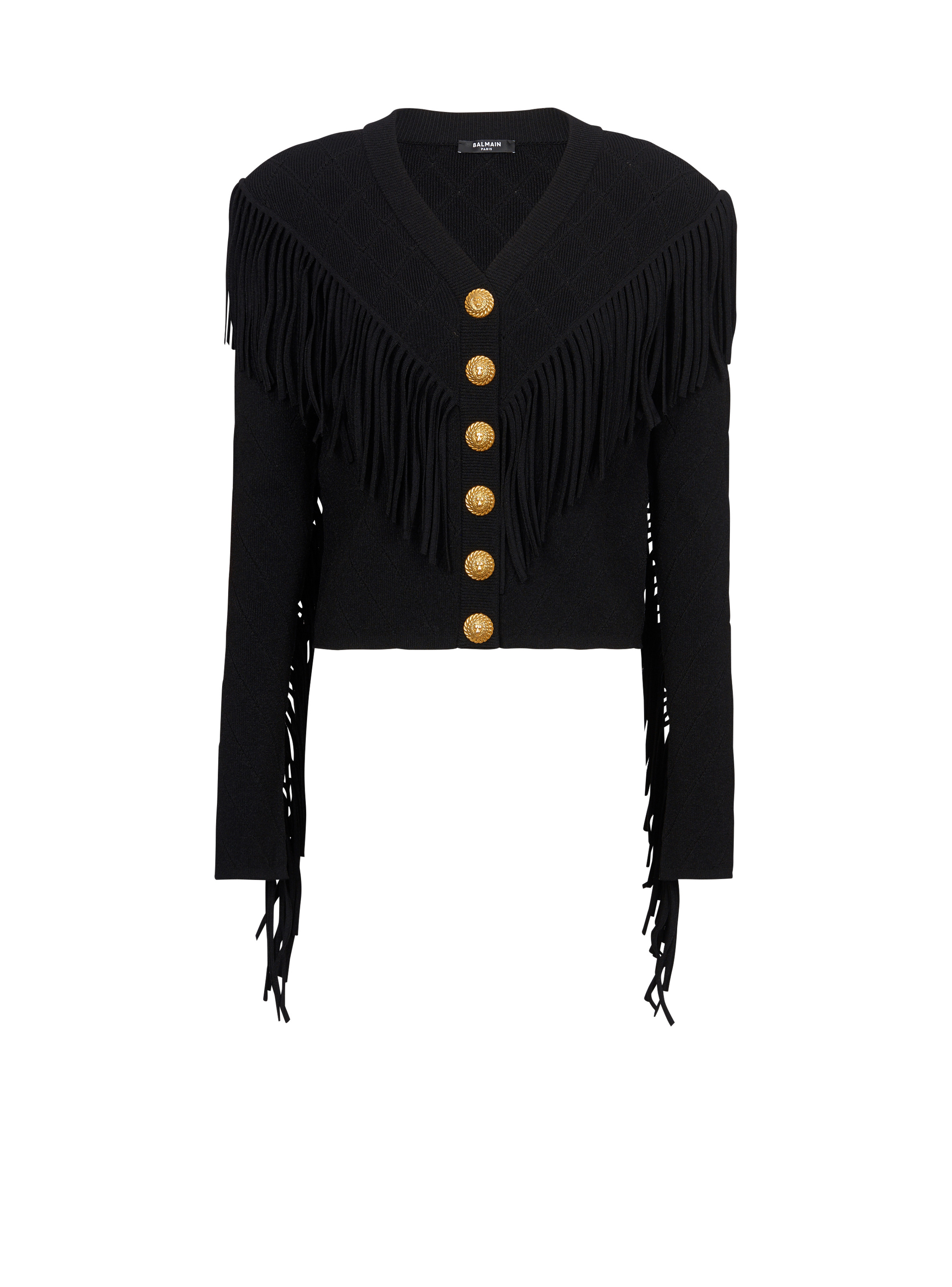 Fringed fine knit cardigan - Lozenge knit, Western cut-out - Fringing front and back - Tight fit - V-neck - Long sleeves - 6 “Signature Lion” golden metal press-stud buttons - Model measures 180cm and wears a size 36 - Main material: 83% viscose 17% polyester - Made in France - Item: CF1KL140KF53100% of the viscose fibres used to make this garment come from responsibly managed and FSC®-certified forests