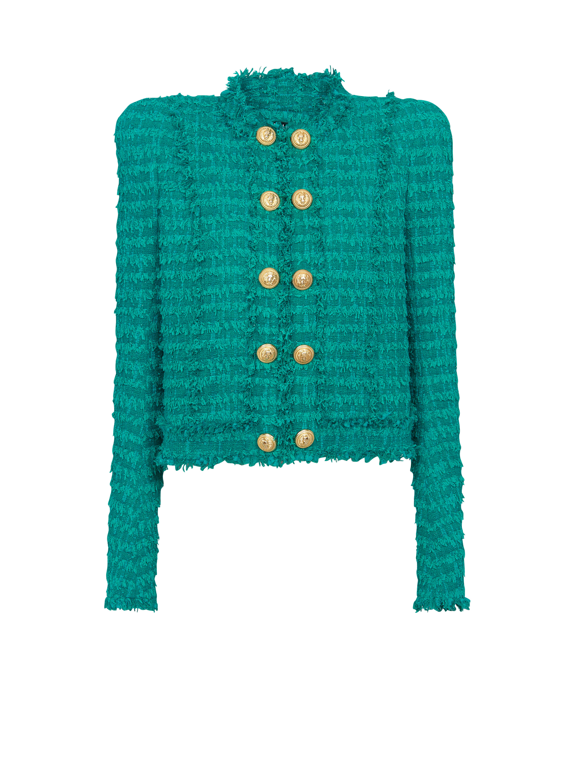 Cotton tweed jacket with fringes - Monochrome tweed check - round collarless neck - trompe-l’oeil button fastening - 10 buttons - shoulder pads - vertical cut-outs on the front and back - long fitted sleeves - buttoned slit at the cuffs - 5 buttons - fringe trim - gold “lion head” embossed buttons - Straight cut - This item fits true to size (select your usual size) - The model is wearing a size S - The model's height is 177 cm - Materials: 50% polyamide, 30% cotton, 19% acrylic, 1% metal - Made in Poland - Item: AF1SK318XE36