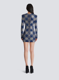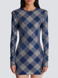 Gingham rhinestone dress - Short fitted cut - Round neckline - Structured shoulders - Long sleeves with invisible zips on the cuffs - Visible silver metal zip fastening on the back with Balmain-engraved slider - Fabric with rhinestone embellishment - Jersey lining - Model measures 179cm and wears a size 36 - Main material: 90% viscose 9% polyamide 1% elastane - Made in Italy - Item: DF0R9352PC62
